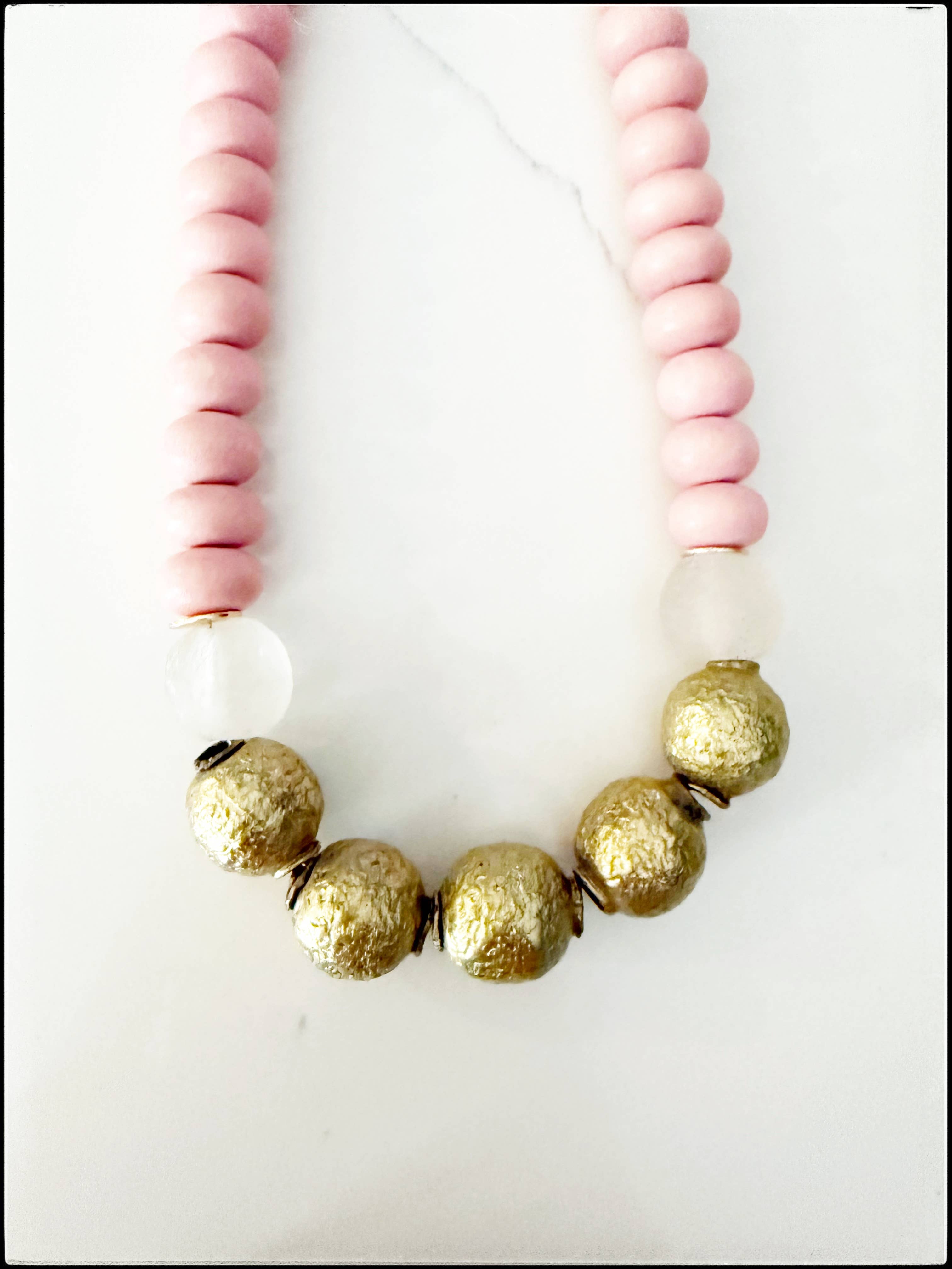 Brass Round Bead Midi Necklace Wood & Recycled Glass Pink