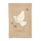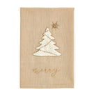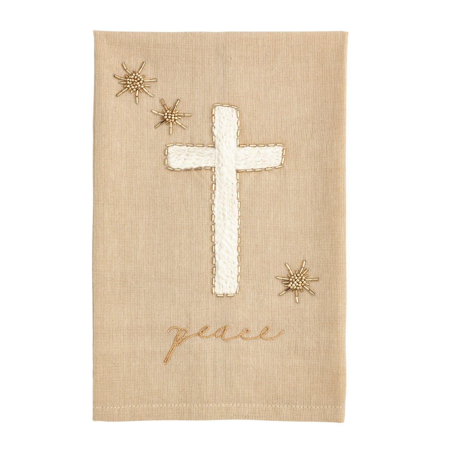Cotton hand towel features gold lurex embroidery and beaded icon