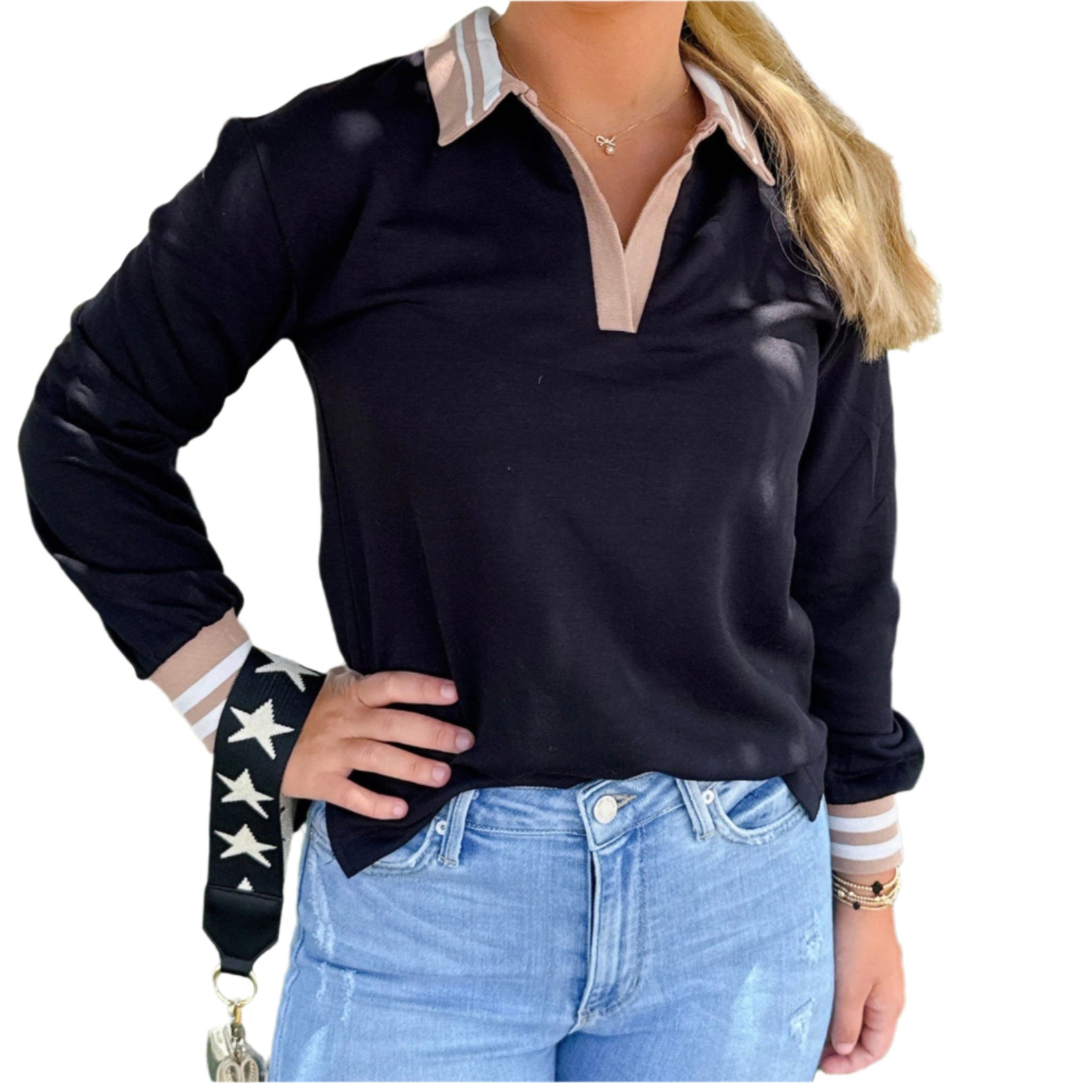 Get game-day ready with the Gabby Black Top! This sleek and comfy top is your perfect companion for cheering on your team in style. Its versatile black shade pairs effortlessly with your favorite jeans or leggings, keeping you cozy and spirited throughout the game. Whether tailgating or in the stands, the Gabby Black Top adds a playful touch to your football festivities.