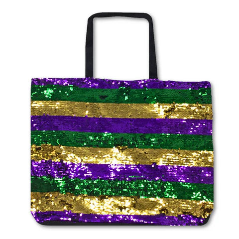 This vibrant tote features purple, green, and gold sequin stripes, capturing the festive spirit of Mardi Gras. The shimmering sequins add a touch of glamour and sparkle to your ensemble, making it a standout accessory for the celebration.