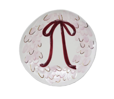 3/4" Round Stoneware Serving Platter w/ Wreath, Bow & Gold Electroplating, Red, Pink & White