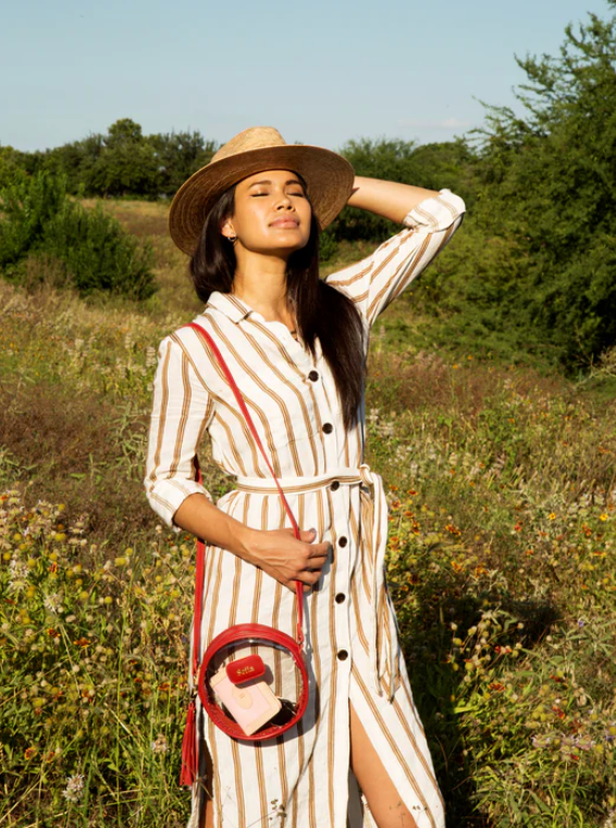 This unique geometric bag is perfect for when you something more than a little different. This stadium compliant bag has plenty of room for essentials and adds a little extra pizazz with a detachable leather tassel. Perfect for concerts and sporting events.