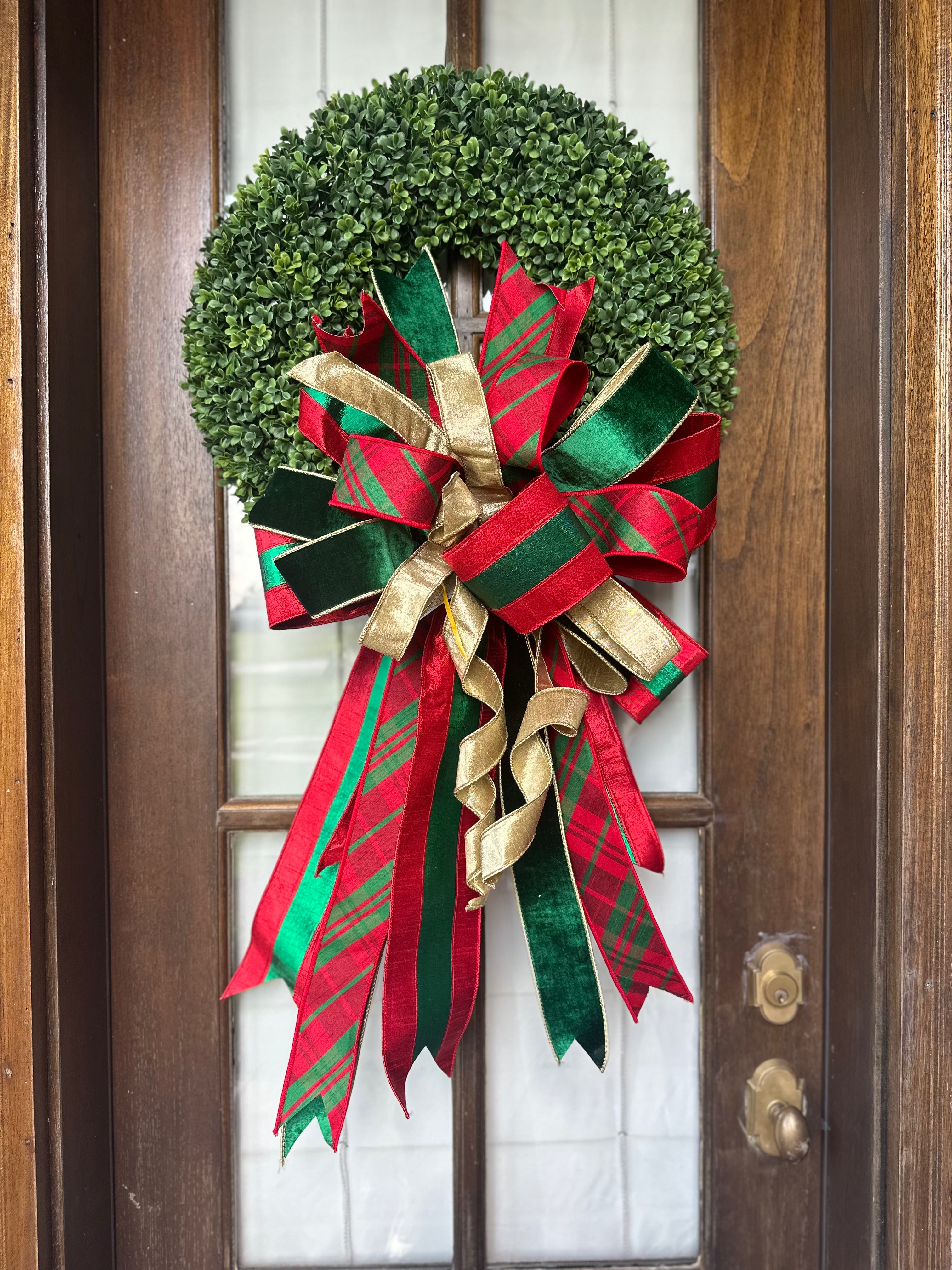 Elevate your holiday décor with the Big Beautiful Christmas Bow, showcasing elegant hues of green, red, and gold. Its rich, festive colors add a refined touch to wreaths, garlands, or gift wrap, creating a warm and inviting atmosphere for the season. This bow is designed to bring classic holiday charm with a sophisticated flair to any celebration.