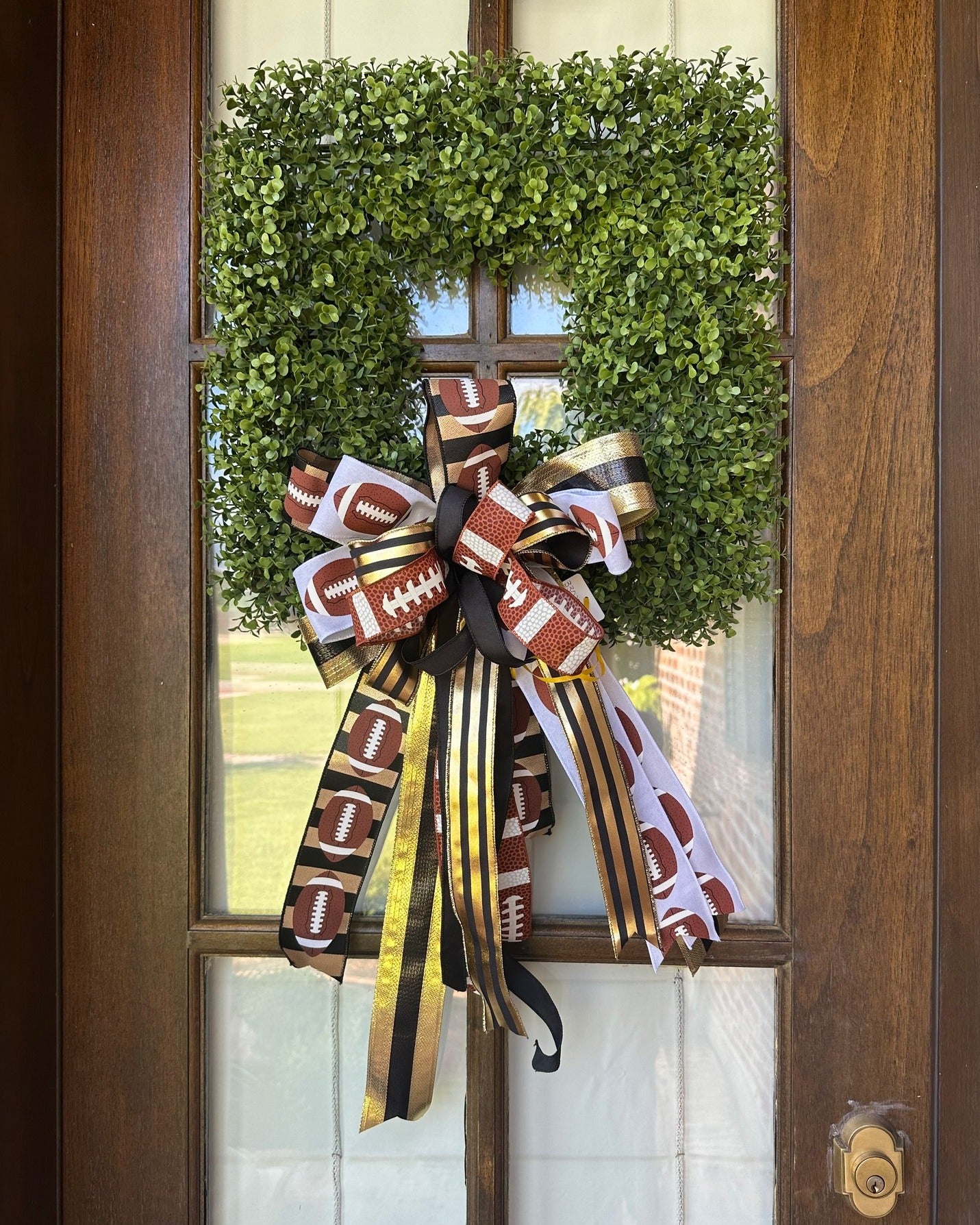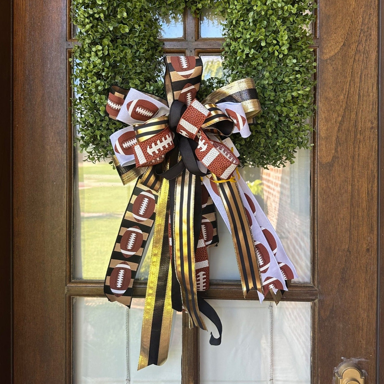 Score a touchdown with this ready-to-go football wreath bow! Just attach it to your wreath and watch your team spirit soar! Perfect for game days, tailgating season, or showing your colors year-round. Ready, set, decorate!
