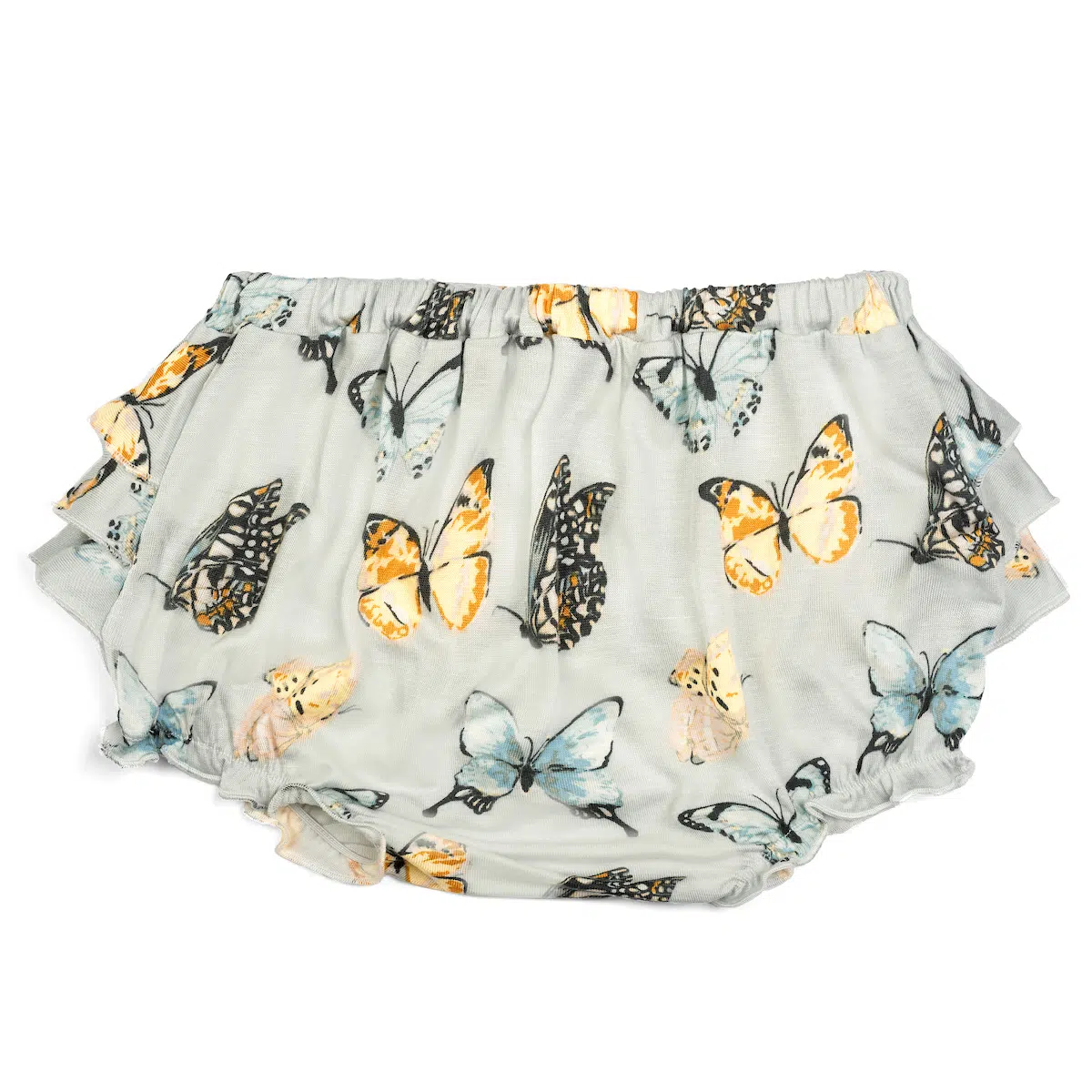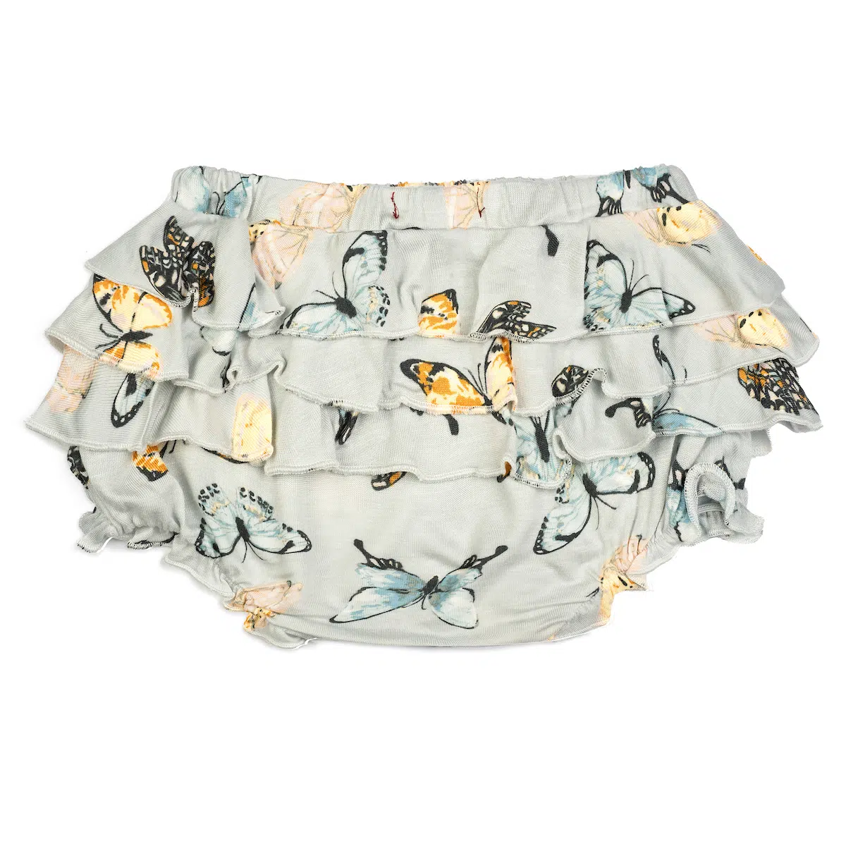 Like riding a hand-carved horse on a carousel or skipping on a beach boardwalk, our little girls give a nod to a bygone era when wearing our comfy Butterfly Bamboo Ruffle Bloomer. Our structured design incorporates 3 cascading, full-width rear ruffles, a gathered elastic waistline, and ruffled legs.