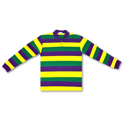 This long sleeve polo shirt features a lively combination of purple, green, and gold, perfect for making a statement.
