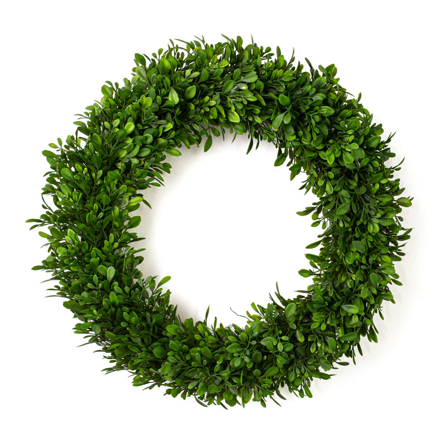 This wreath is built on an artificial angel vine frame that gives it depth. The boxwood leaves are short but densely clustered. The leaves variegate in different places from light green to dark green, giving the foliage realism. Use with a simple sash or add florals and picks.