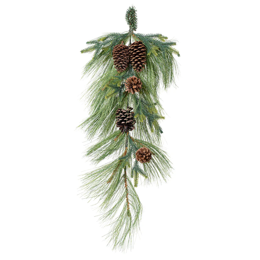 This teardrop layers sprigs of long-needled pine with short-needled pine and real pinecones. Dress it up with a bow or add a pop of color with berries.