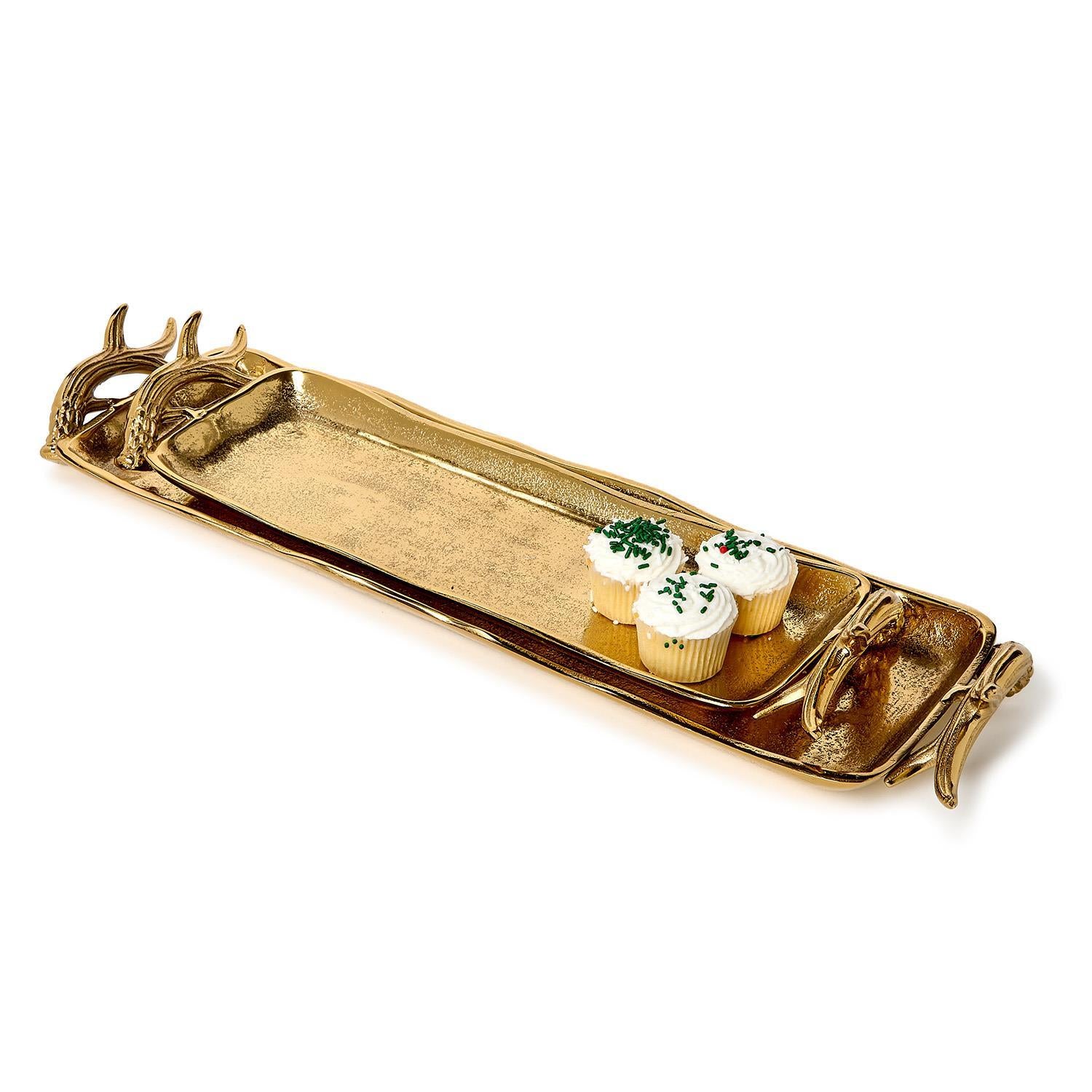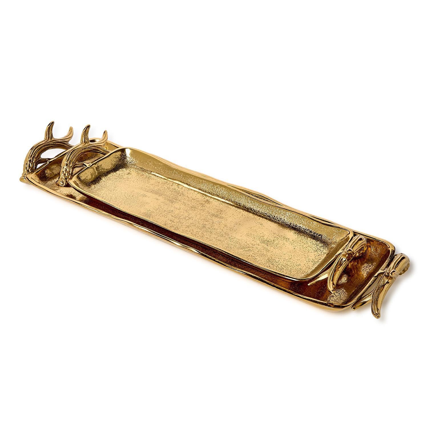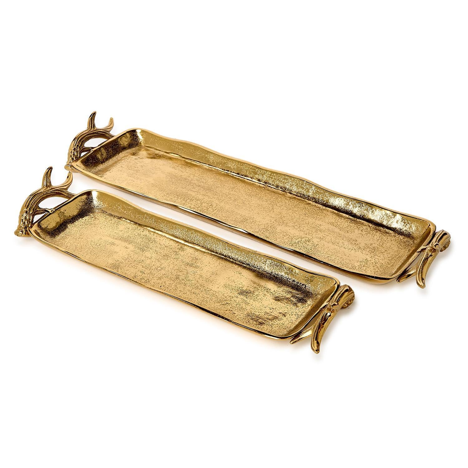 Add a touch of wild charm to your gatherings with our Gold Stag Antlers Serving Trays. Available in long or short sizes, these trays bring a playful twist to serving snacks or displaying décor. Perfect for entertaining guests or adding personality to any table setting, they combine rustic elegance with a hint of fun. Choose your size and let the stag’s spirit elevate your next get-together!