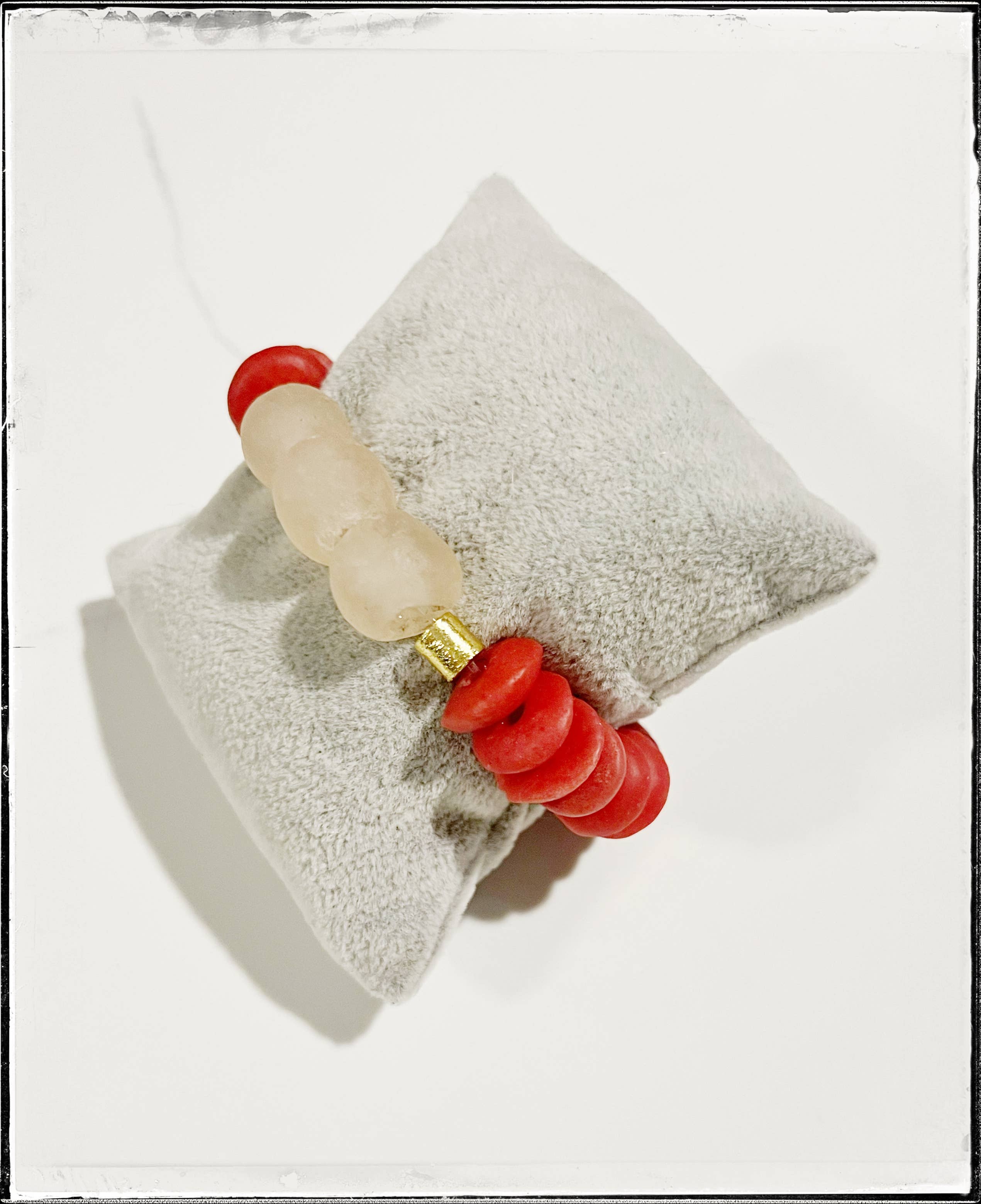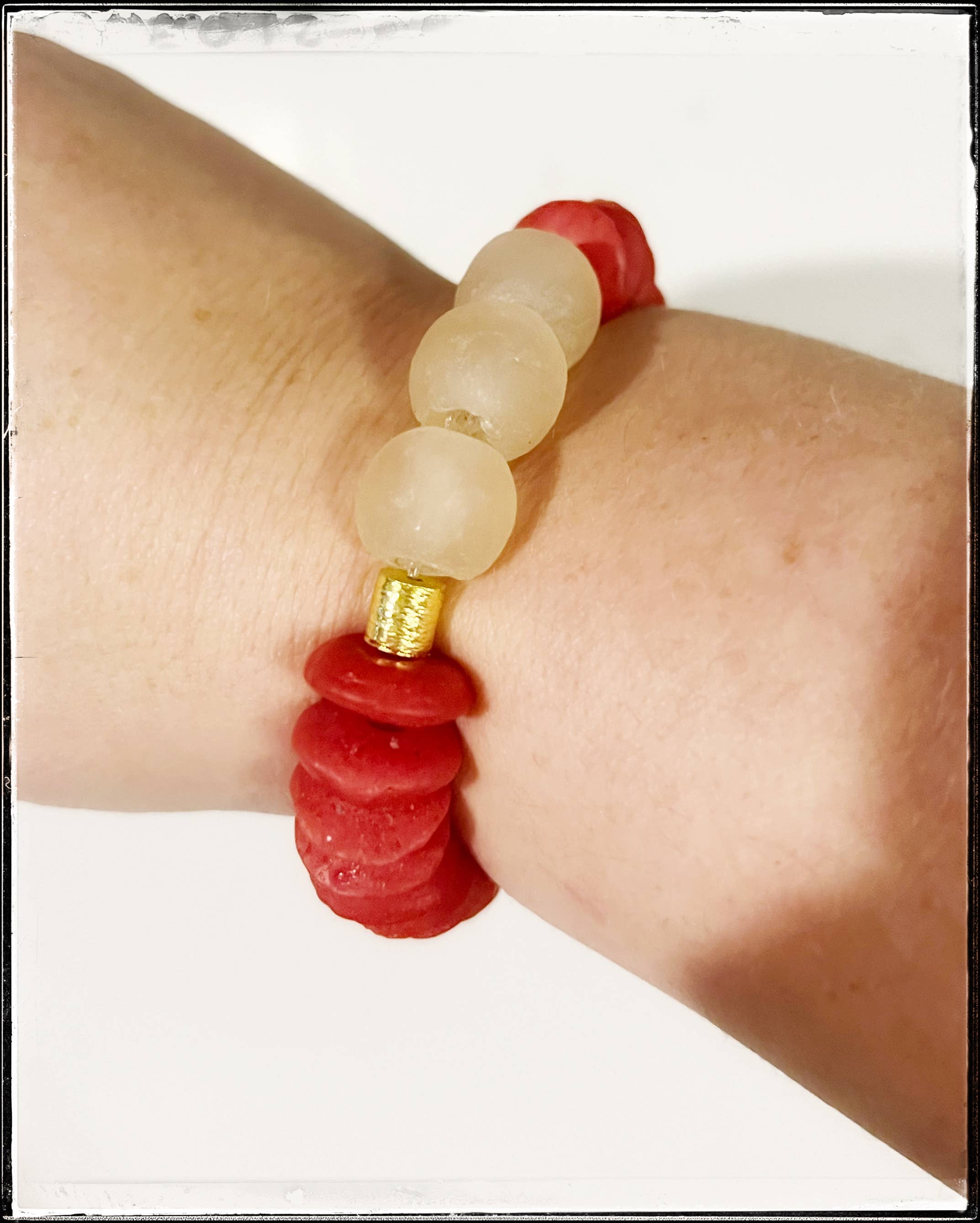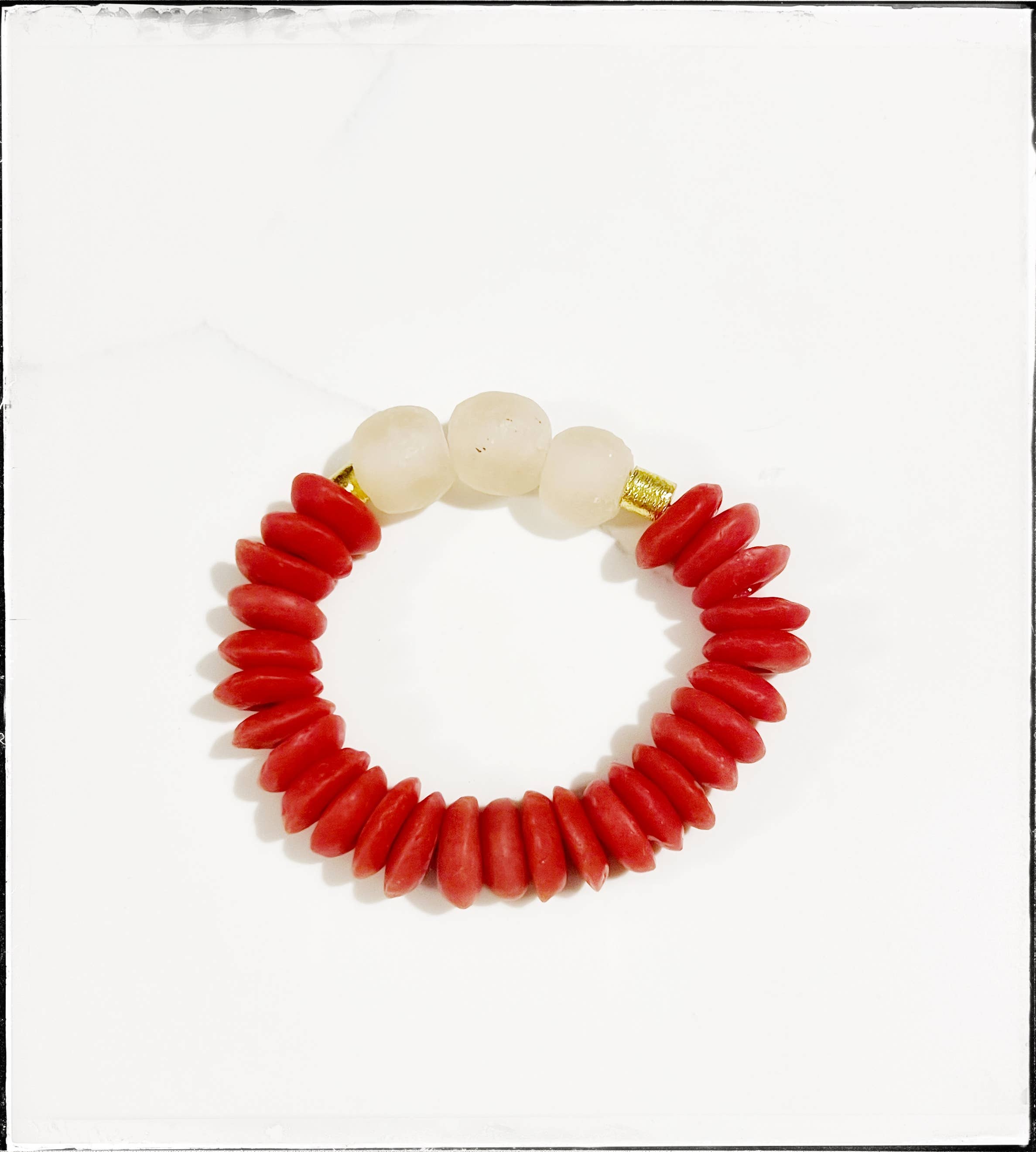 Ashanti Glass & Brass Bead Stretch Bracelet- Red & White