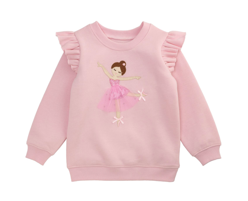 Appliqued brushed French terry sweatshirt with tulle applique, ruffle shoulders and cotton rib neckline, sleeve openings and hem.