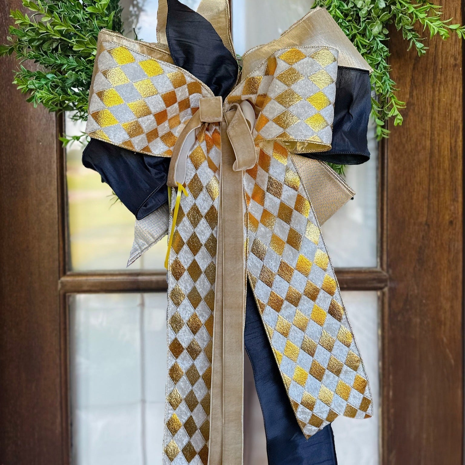 The Black & Gold Harlequin Door Bow is a sophisticated way for Saints fans to decorate their front door with elegance. Featuring a classic harlequin pattern in rich black and gold, this bow adds a refined and welcoming touch to your home. Perfectly crafted to enhance your entrance, it blends team spirit with timeless style.