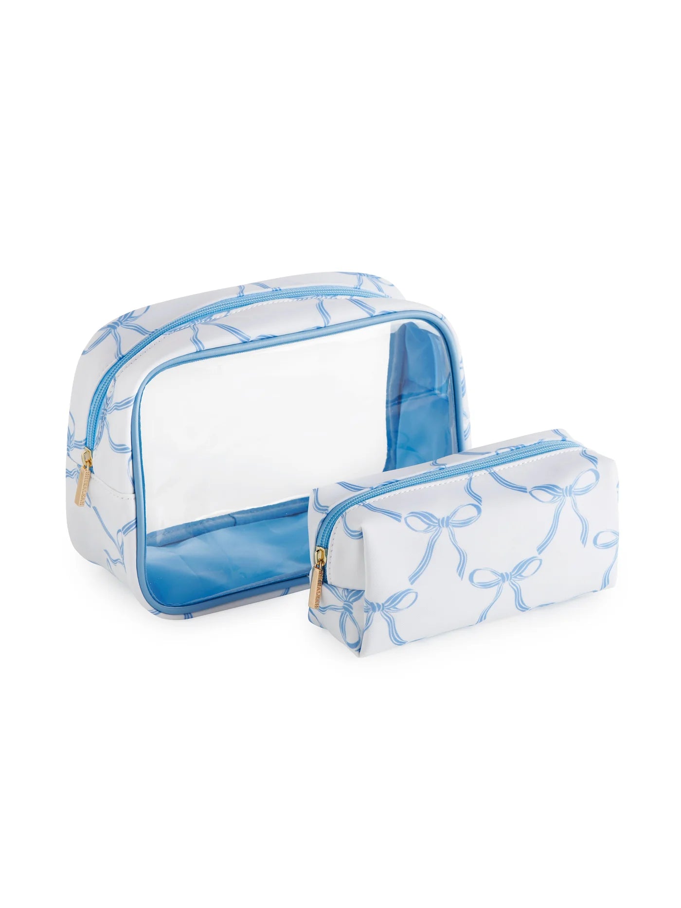 Meet the Bow Set of 2 Cosmetic Cases—your travel essentials just got a chic upgrade! The set includes one transparent case for quick grab-and-go access and one adorable printed case adorned with dainty blue bows for keeping all your smaller items perfectly organized. Stylish and practical, these lightweight pouches are ideal for storing makeup, toiletries, or any small treasures you want to keep safe on the go. Whether you're packing for a weekend getaway or keeping your everyday essentials tidy, this duo has you covered in style.