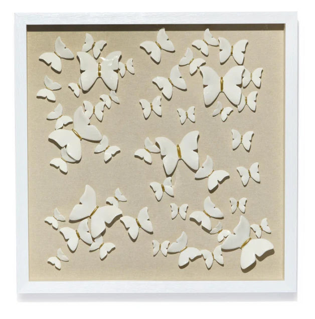 Transform any room into a serene garden with our Butterflies in Bloom Shadow Box Wall Art. Delicately crafted from porcelain, this exquisite piece features lifelike butterflies captured in a shadow box, adding depth and charm to your space. The intricate details and handcrafted feel make this wall art a standout piece in any home.
