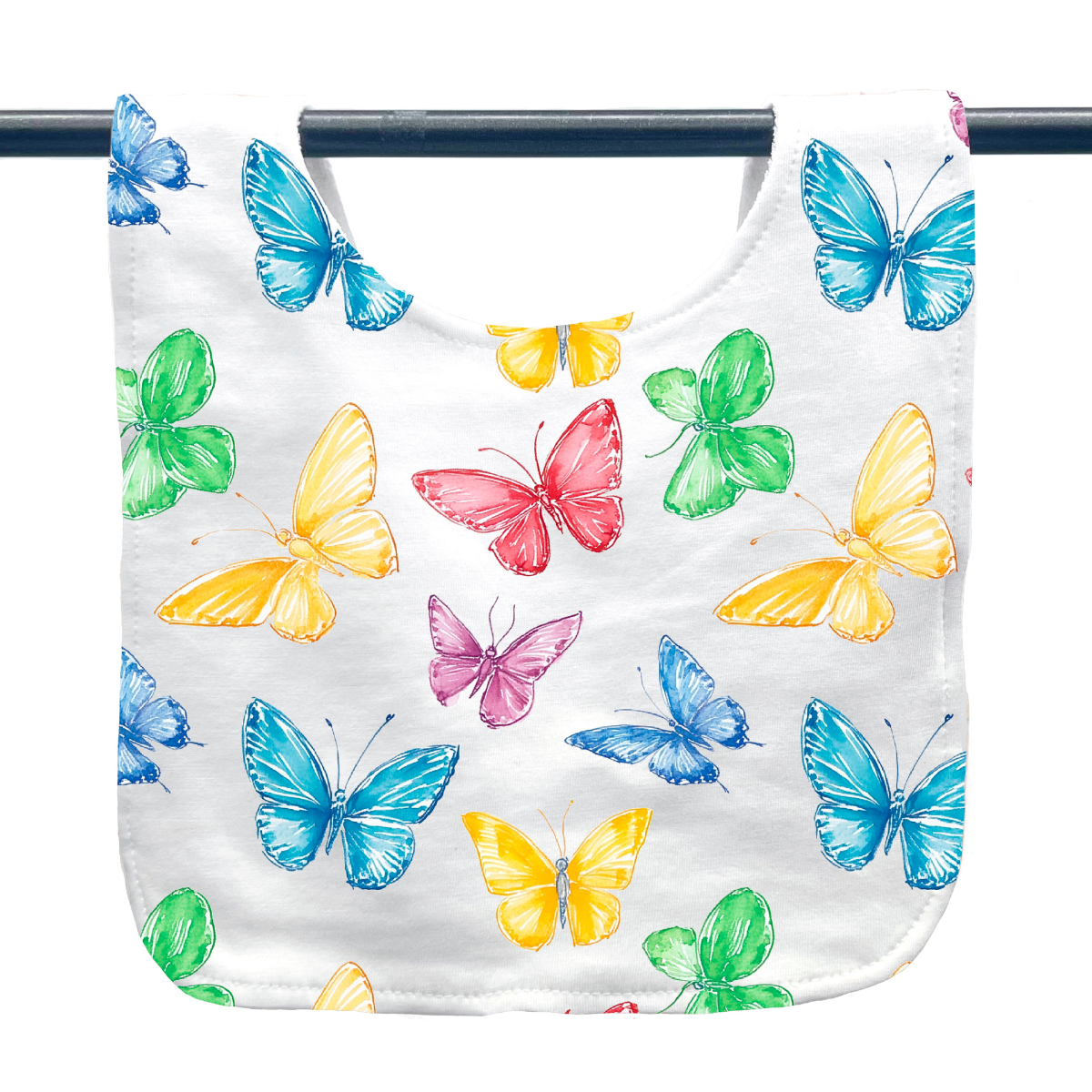 Make mealtime magical with this colorful Butterfly Baby Bib, featuring a delightful all-over print of fluttering butterflies in a rainbow of soft, cheerful colors against a clean white background. Light, bright, and full of charm, this bib brings a whimsical touch to everyday messes.