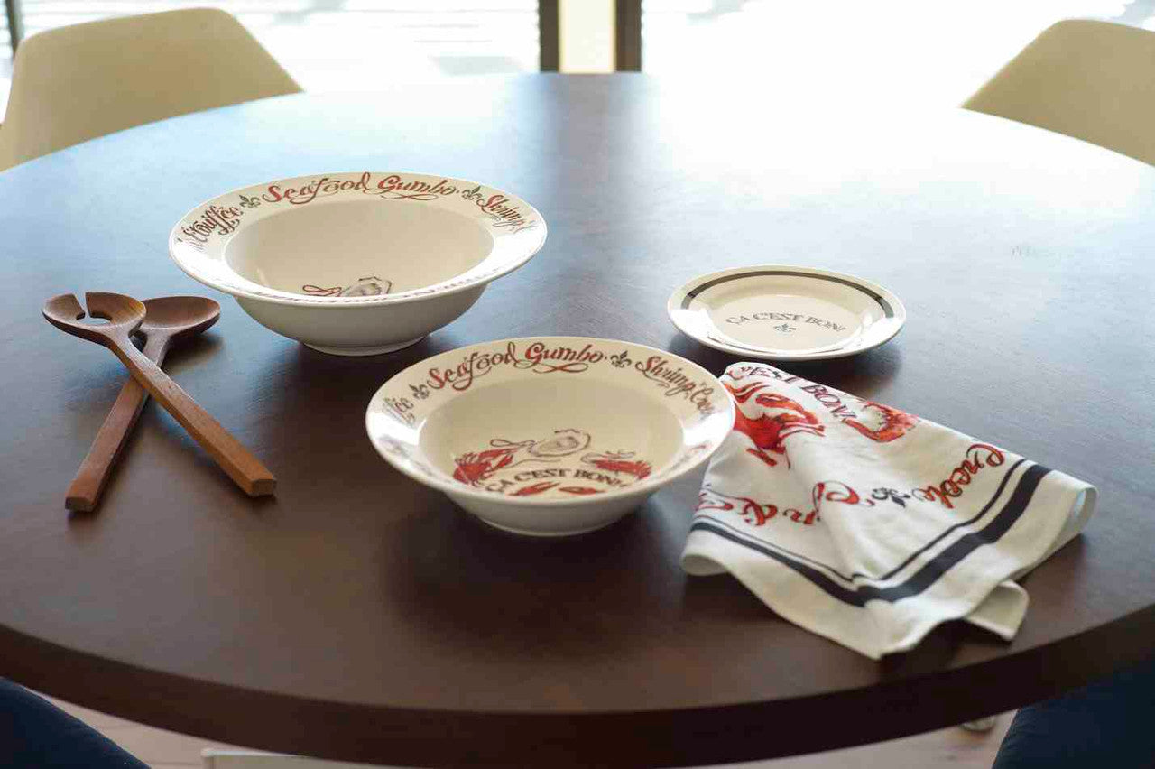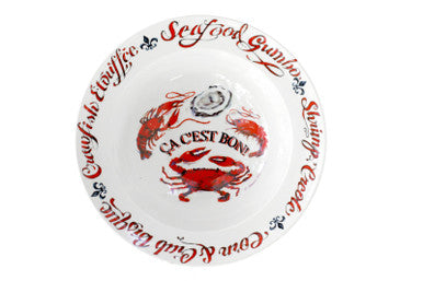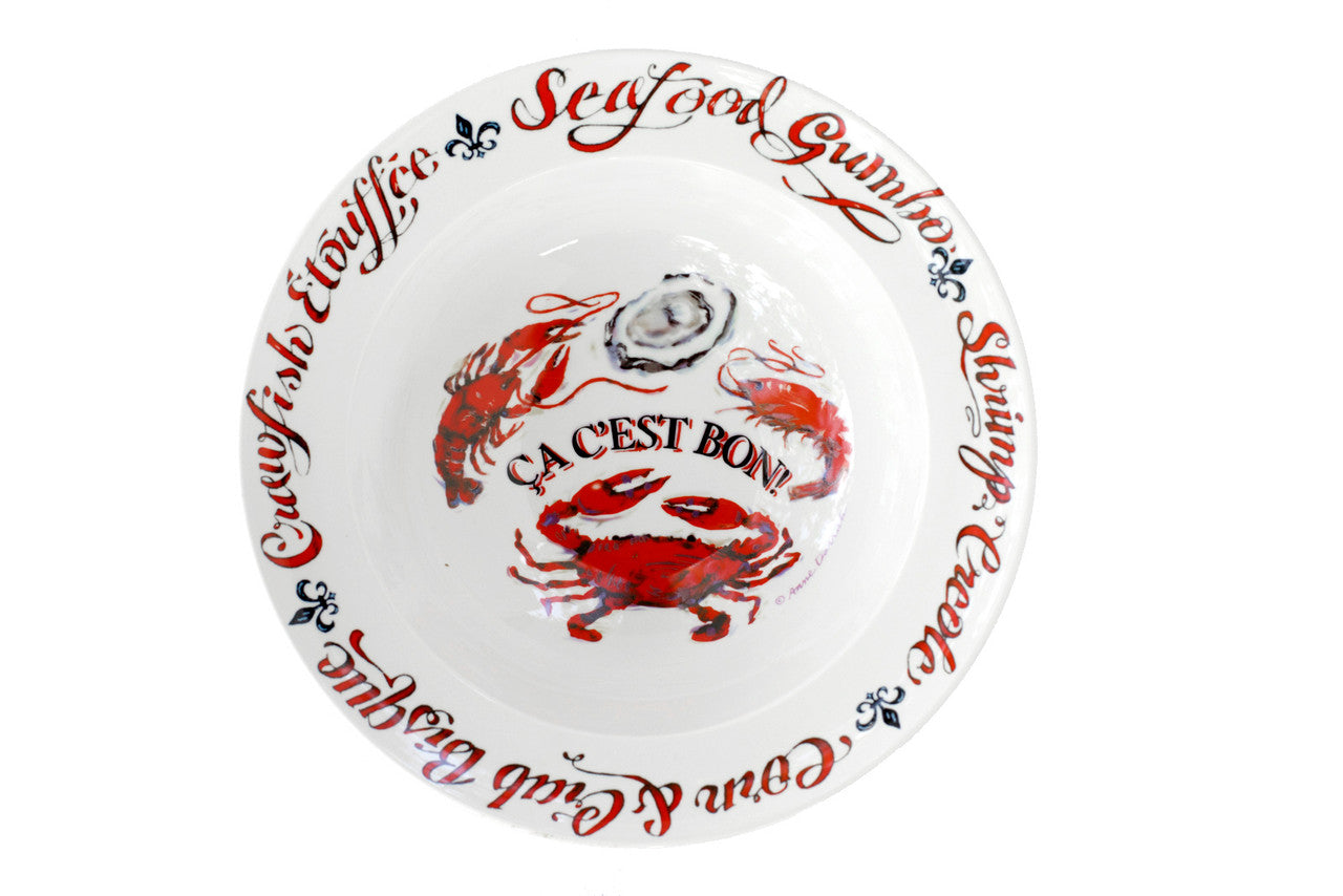 This ceramic gumbo bowl features our “Ca C’est Bon” design. it includes images of a fleur de lis, shrimp, oyster, crab and crawfish along with the words “Seafood Gumbo”, “Shrimp Creole”, “Crawfish Etouffee” and “Corn Crab Bisque” in red and black printed on white.