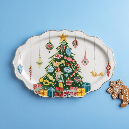 Celebrate the holiday season with this exquisite Christmas Tree Ornament Platter, a perfect addition to your festive gatherings. Crafted from high-quality dolomite, this ceramic platter showcases a beautifully hand-painted ruffle edge, adding a touch of elegance to your table setting. Measuring 10 3/4" x 16", it offers ample space for serving your favorite holiday treats, from cookies and candies to appetizers and desserts. Its charming design captures the spirit of Christmas, making it an ideal centerpiece for your dining table or a thoughtful gift for loved ones. Durable and easy to clean, this platter combines functionality with festive flair, ensuring it will be a cherished part of your holiday traditions for years to come.
