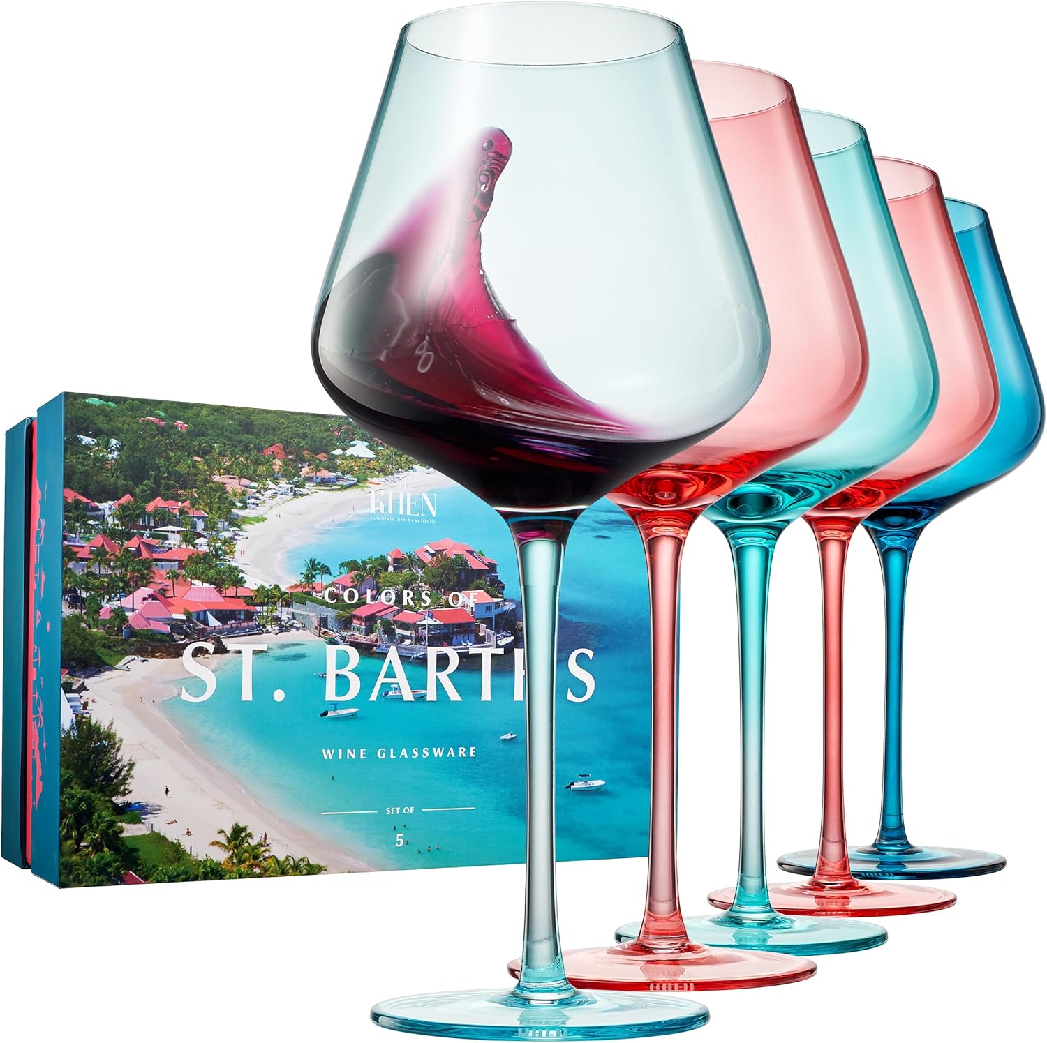 - The St. Barths Colored Wine Glasses set is a thoughtful gift for travelers and beach lovers. This set includes five 20-ounce stemmed wine glasses, each designed with colors that represent the beautiful island of St. Barths. These decorative colors capture the essence of the beach, making each glass a unique and attractive addition to any collection.