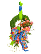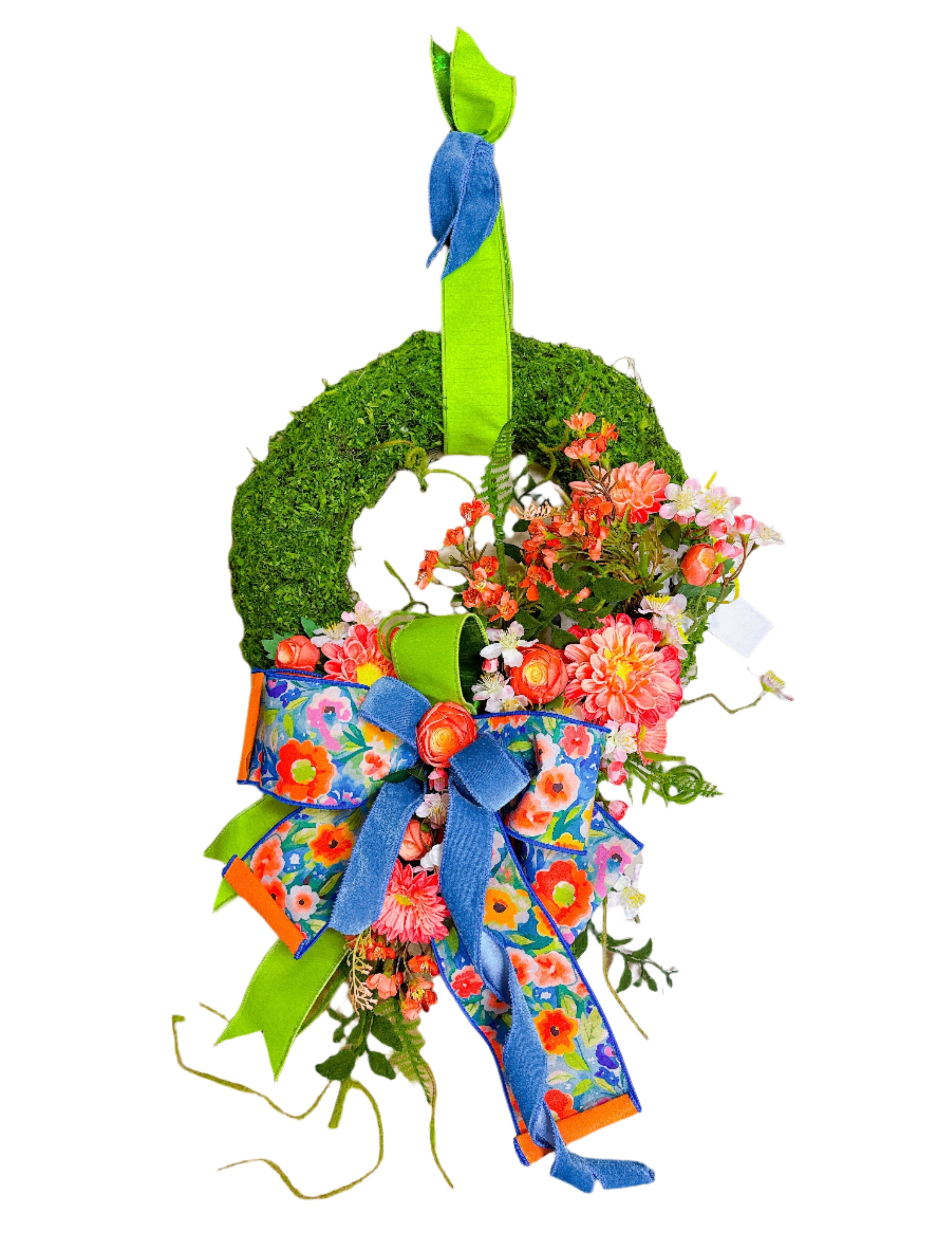 Add a touch of whimsy to your space with our Coral Dahlia Leaf Moss Wreath! Featuring vibrant shades of blue, lime green, and orange, this wreath will bring a fun and playful pop of color to any house!