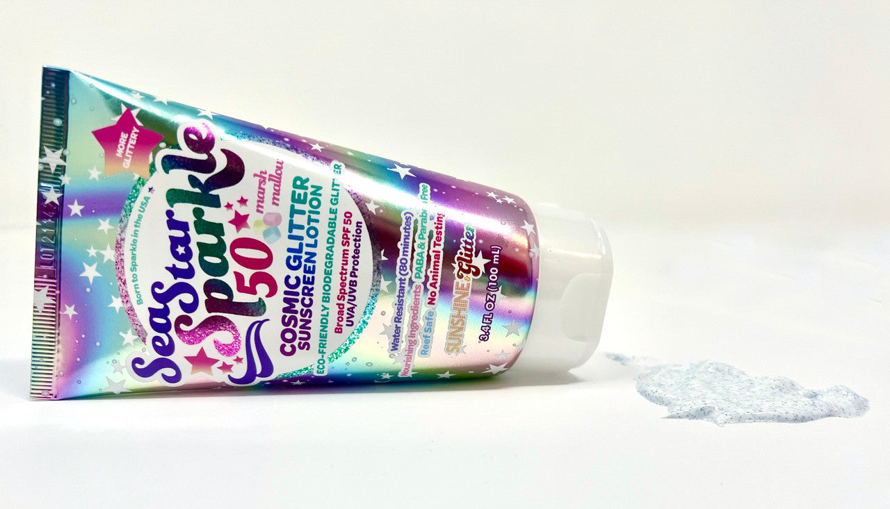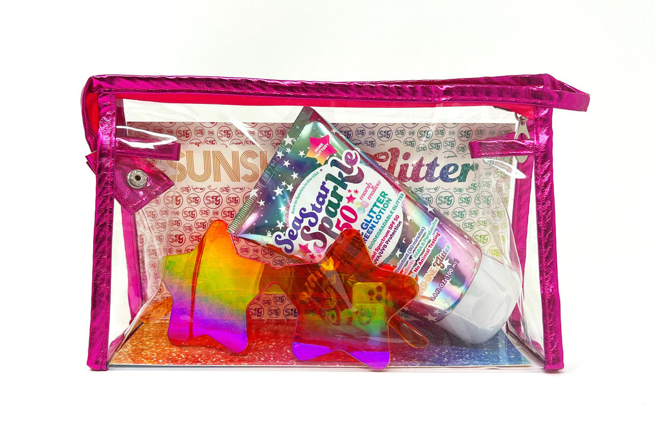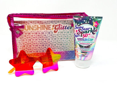 Up up and away! You'll be all set for sunshine and all your Cosmic adventures with this travel-ready set!Gift Set Includes:1 - 3.4 oz bottle of Cosmic Stardust SPF 50 with marshmallow scent and iridescent cosmic biodegradable glitter 1 - pair of holographic star-shaped sunnies 1 - metallic pink zippered cosmetic travel bag
