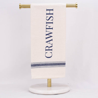 Cotton hand towel with horizontal stripes near hem and finished with playful Southern favorites.