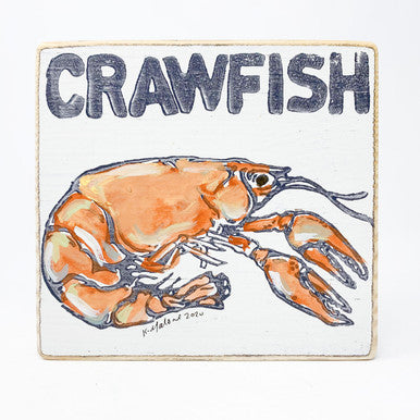 Distressed wood sign with a painted Crawfish: 6" wide x 5.5" tall x 3/4" thick with keyhole slot on back for easy, flush-mount hanging.