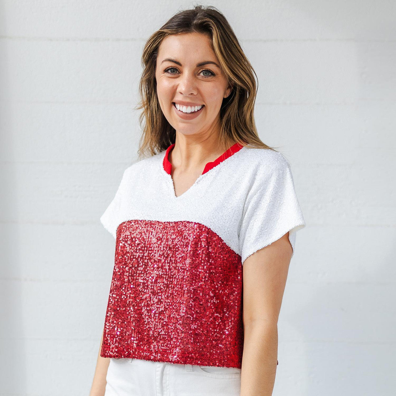 Diane Crimson & White Colorblock Sequin Top