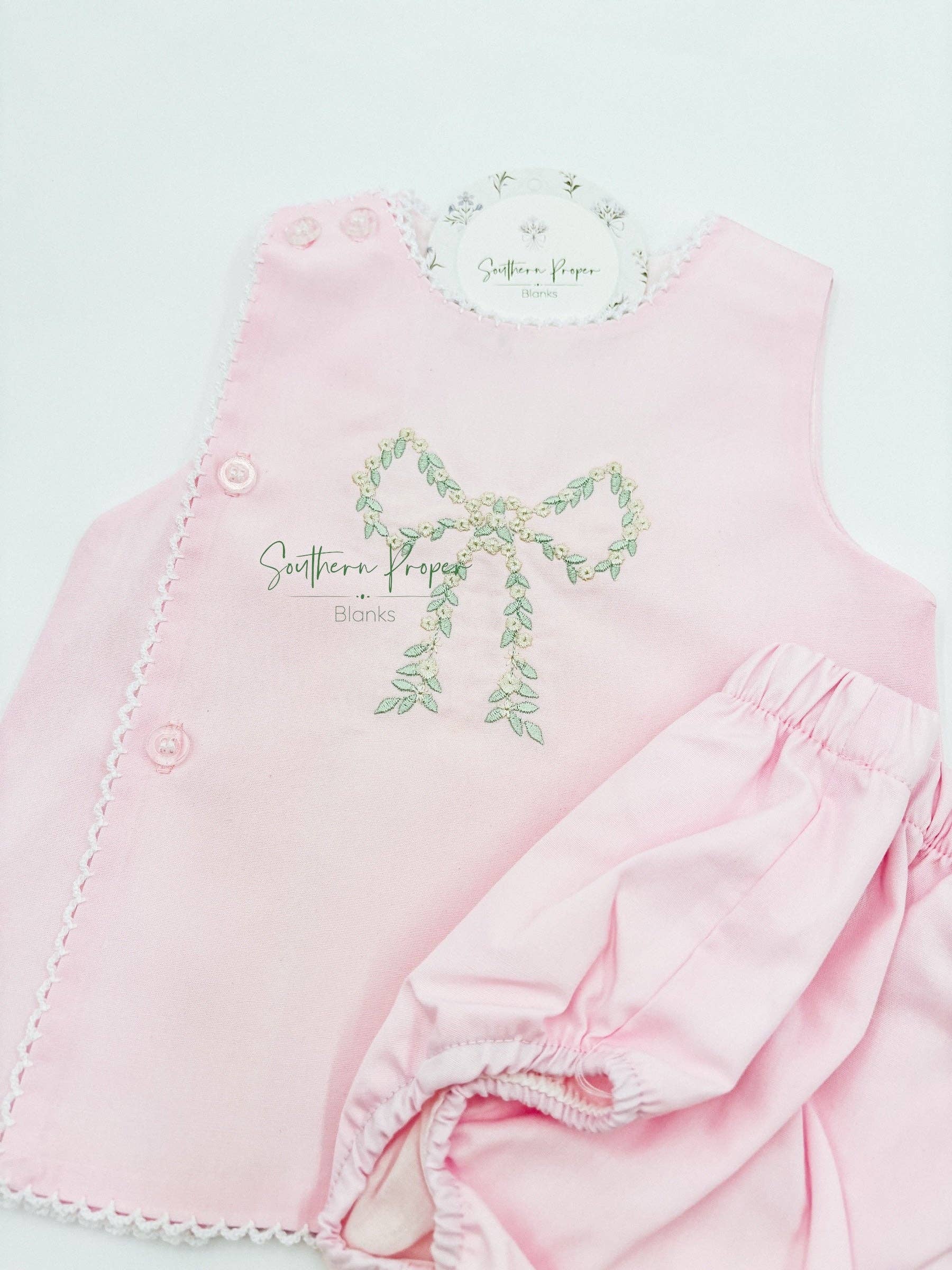 New 2pcs Diaper Set. This classic Pink diaper set with added picot trim will be your got to this summer! Classic staple piece and perfect for a simple or extravagant embroidery Material- polyester/cotton blend