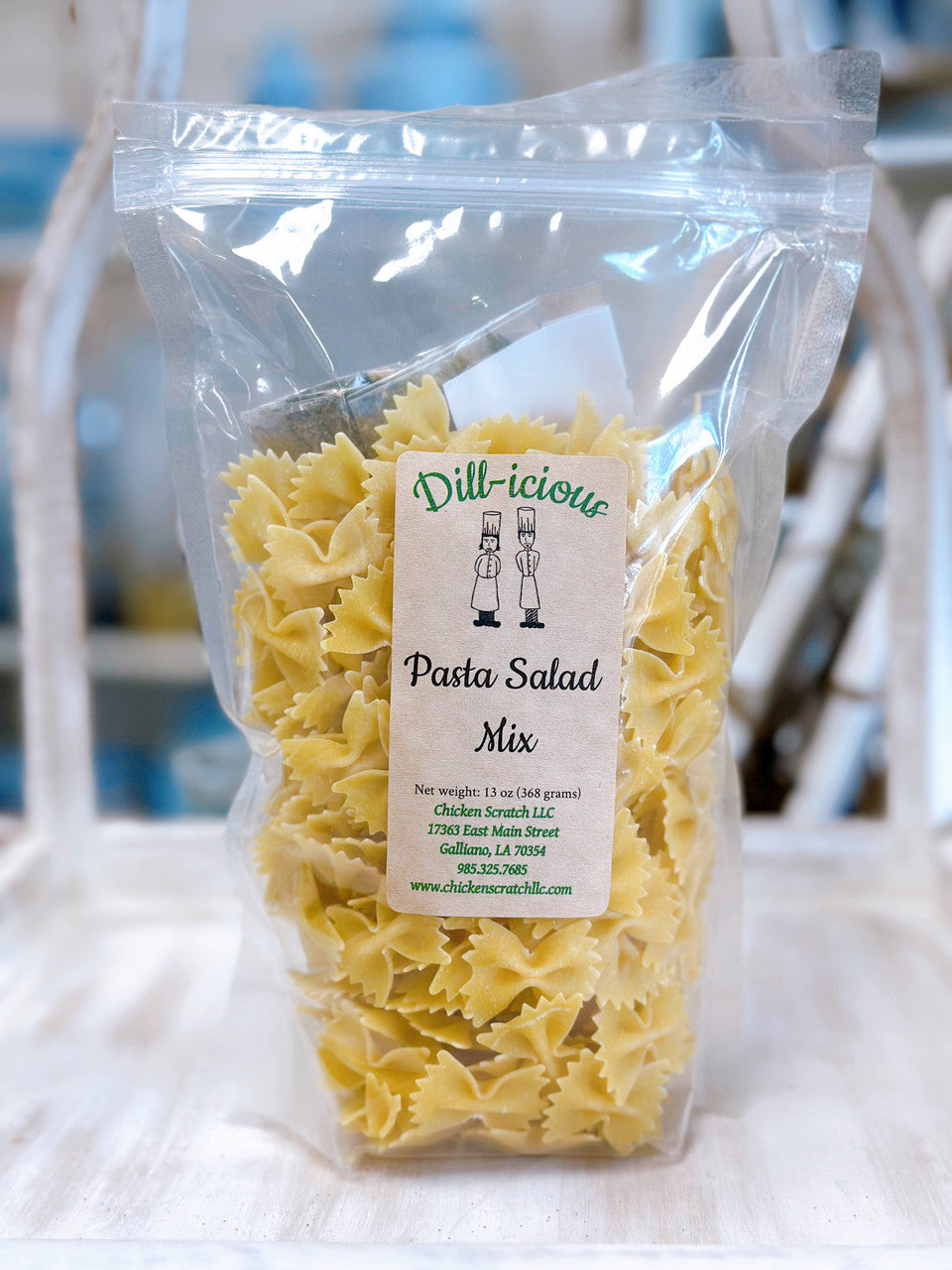 A blend of dill and Cajun spices to create a zingy pasta salad. Simply boil pasta in salted water until desired doneness, then add seasoning packet with mayo and olive oil. You can also add any of the following for a special twist: Sliced red onions, bell peppers, olives, Parmesan cheese, tomatoes, steamed broccoli, pine nuts, almonds, boiled shrimp, crawfish, or roasted chicken.