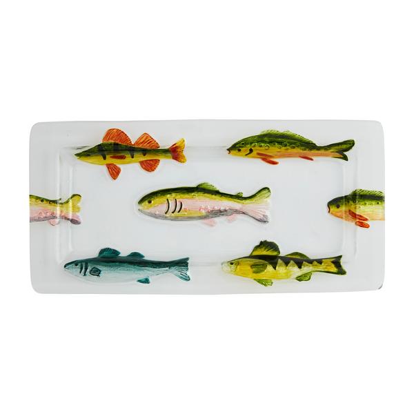 Glass Fish Platter. This exquisite hand-painted glass fish platter is a stunning addition to any dining setting, offering a unique blend of artistry and functionality. Measuring 7 1/4" x 15", it provides ample space for serving a variety of dishes, from appetizers to main courses. The vibrant colors and intricate details of the fish design make it a captivating centerpiece, perfect for entertaining guests or enhancing everyday meals. Crafted from high-quality glass, this platter is both durable and elegant, ensuring it will be a cherished piece in your collection for years to come. Ideal for those who appreciate fine craftsmanship and distinctive tableware.