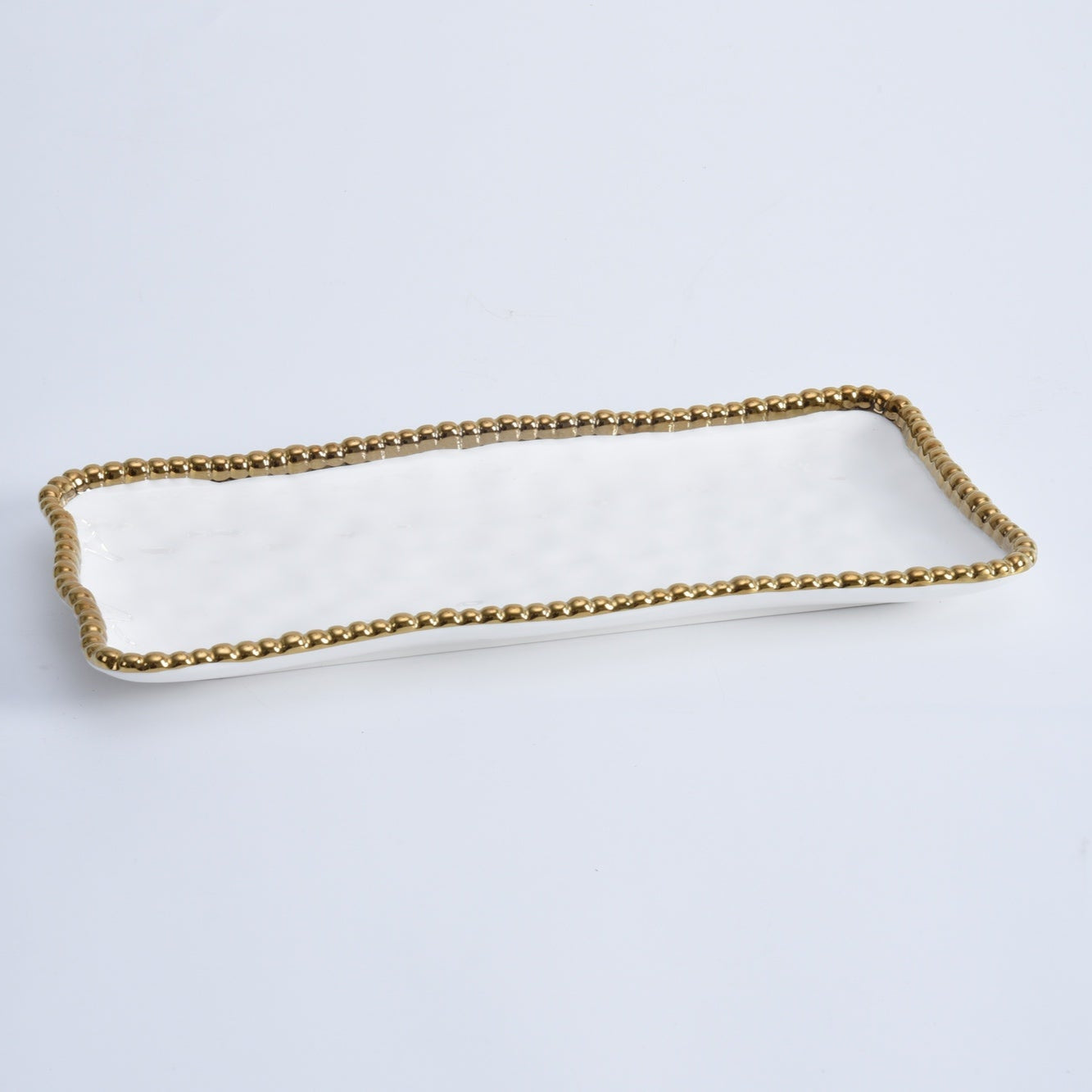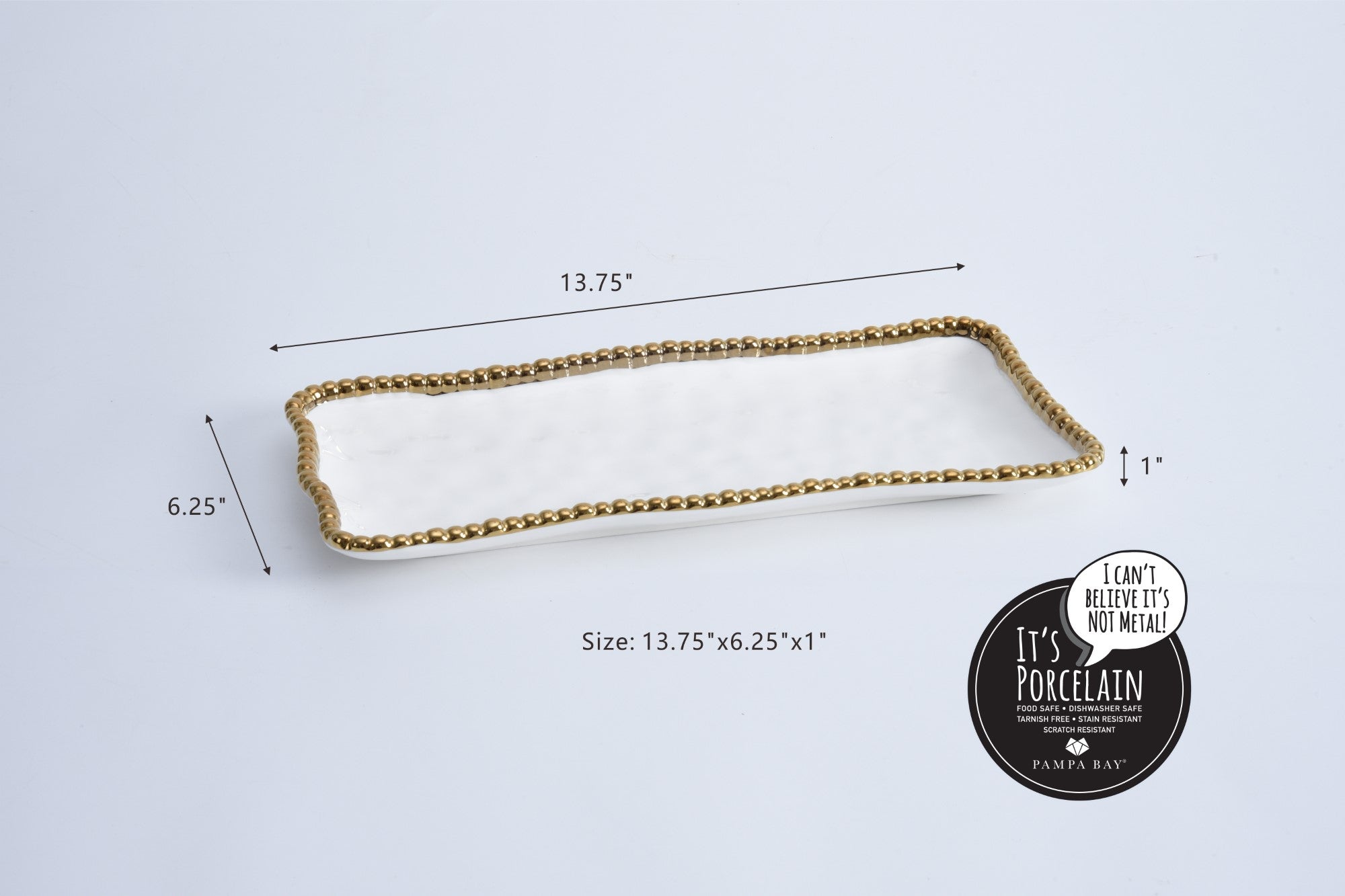 Medium Rectangular Tray in Golden Salerno. Perfect for serving bite-size appetizers and desserts like mini-cupcakes, cookies and deviled eggs.? Or pair with a small bowl for a wonderful crudité and dip.? High-fired white porcelain with lustrous gold beads in titanium.? Food safe. Dishwasher safe. Oven safe to 500°. Easy Care.