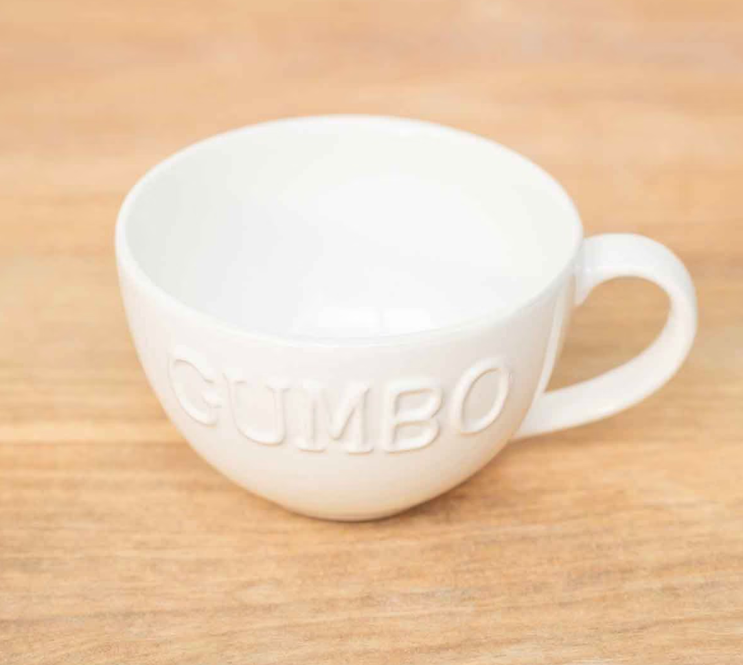 Ceramic singles serving gumbo bowl with handle and embossed text.