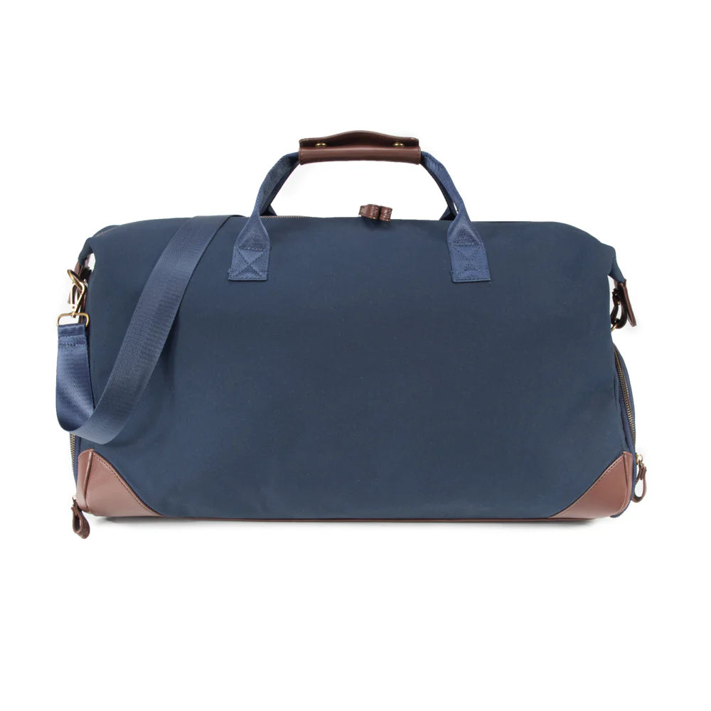 Travel in style with the Harrison Duffel Bag! This trendy bag is crafted from water-resistant cotton canvas and premium vegan leather, so it's sure to make a statement. It features an exterior zipper pocket for your phone or passport, as well as two exterior pockets for shoes and extra storage, so you'll be well prepared for any trip. Plus, the interior padded compartment can fit up to a 15" laptop and includes an interior zipper pocket to keep your essentials secure. With its 51" detachable and adjustable strap, you'll stay comfortable while carrying your bag. Get ready to explore the world!