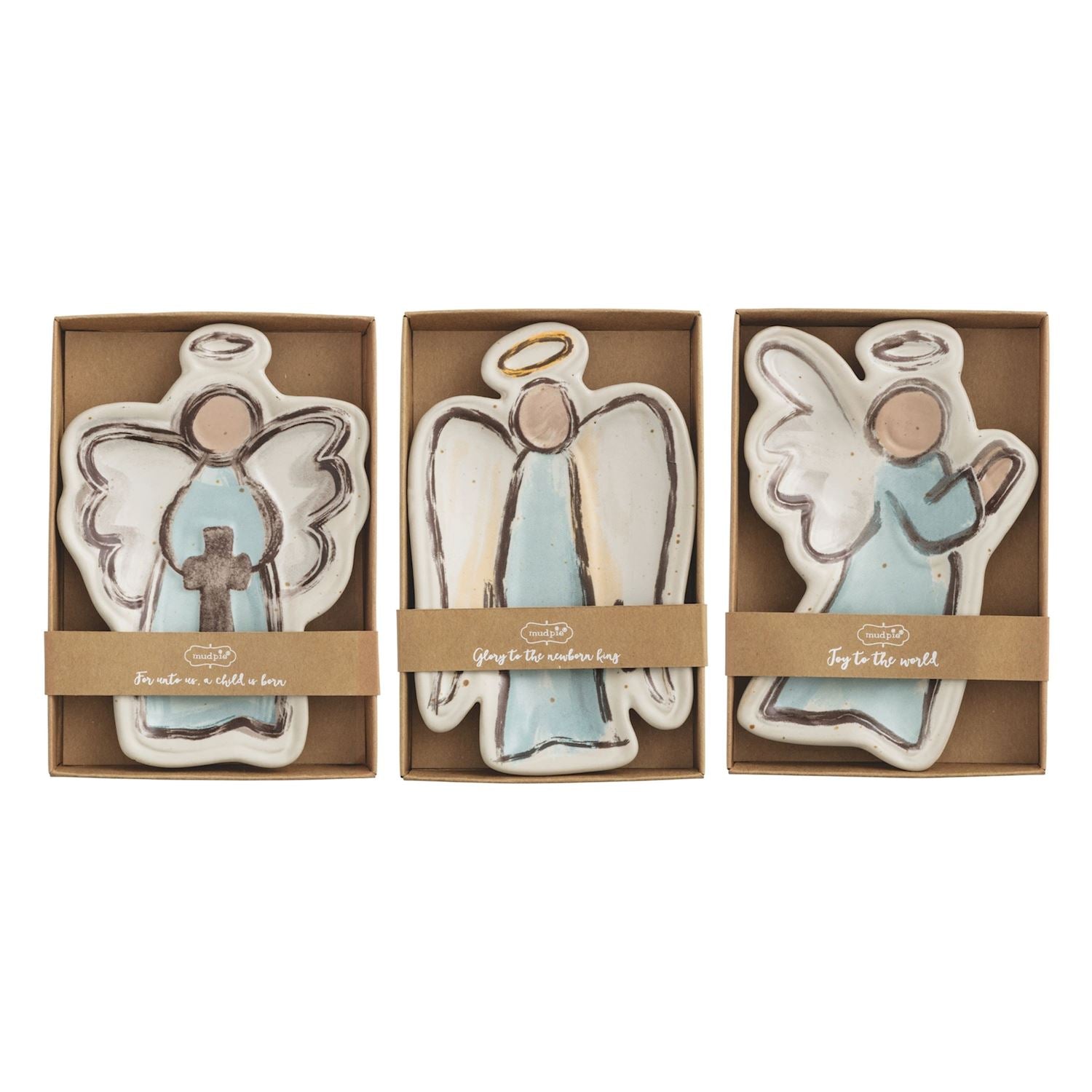 Angel Tidbit Dish. This exquisite hand-painted stoneware dish features a charming angel design with elegantly extended wings, perfect for adding a touch of celestial beauty to your table setting. Measuring 5 1/2" x 3 3/4", it's ideal for serving small snacks, appetizers, or desserts. Crafted from durable stoneware, this dish is both microwave and dishwasher safe, ensuring convenience and ease of use. Its unique design makes it a delightful addition to any home decor, as well as a thoughtful gift for loved ones.