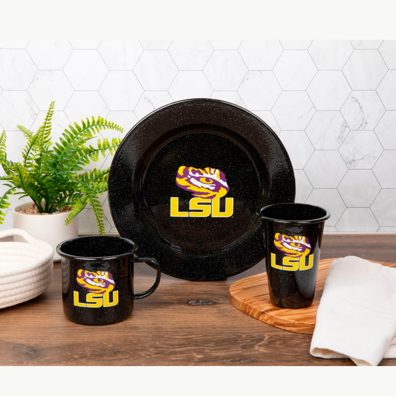 Introducing our LSU 'Tiger Eye' 16 oz Large Enamelware Mug from the Collegiate Collection, a great way to show off your school pride while enjoying your favorite beverages. Crafted from durable enamelware, this mug features the iconic Tiger Eye logo, making it the ideal gift for any LSU fan. With its generous size and sturdy construction, this mug is perfect for sipping coffee, tea, or hot chocolate, making it a must-have for game days or everyday use. This item is designed to be perfectly paired with other items in this collection.