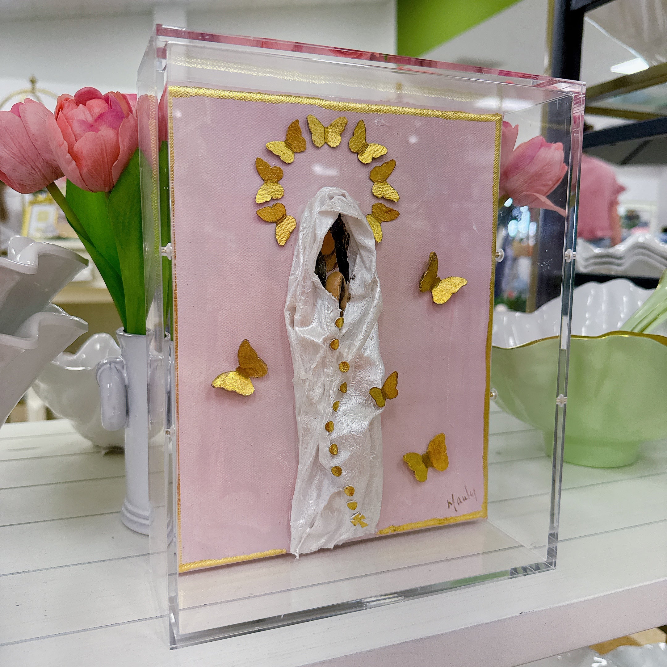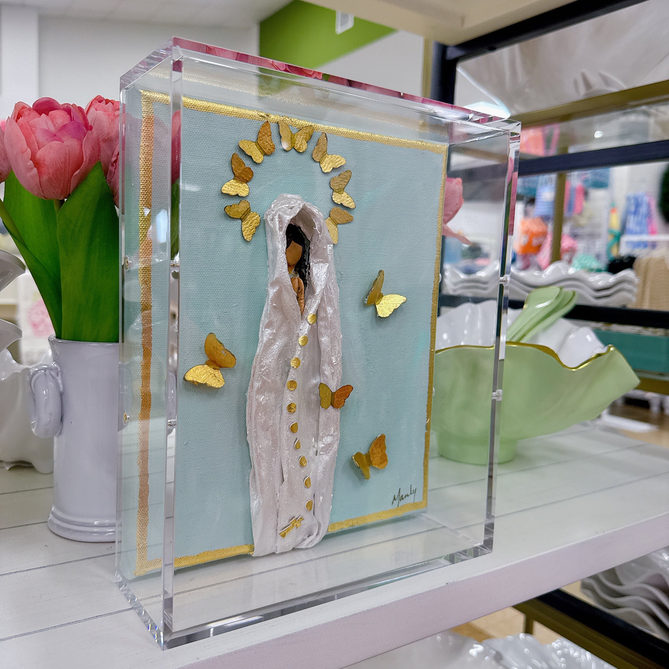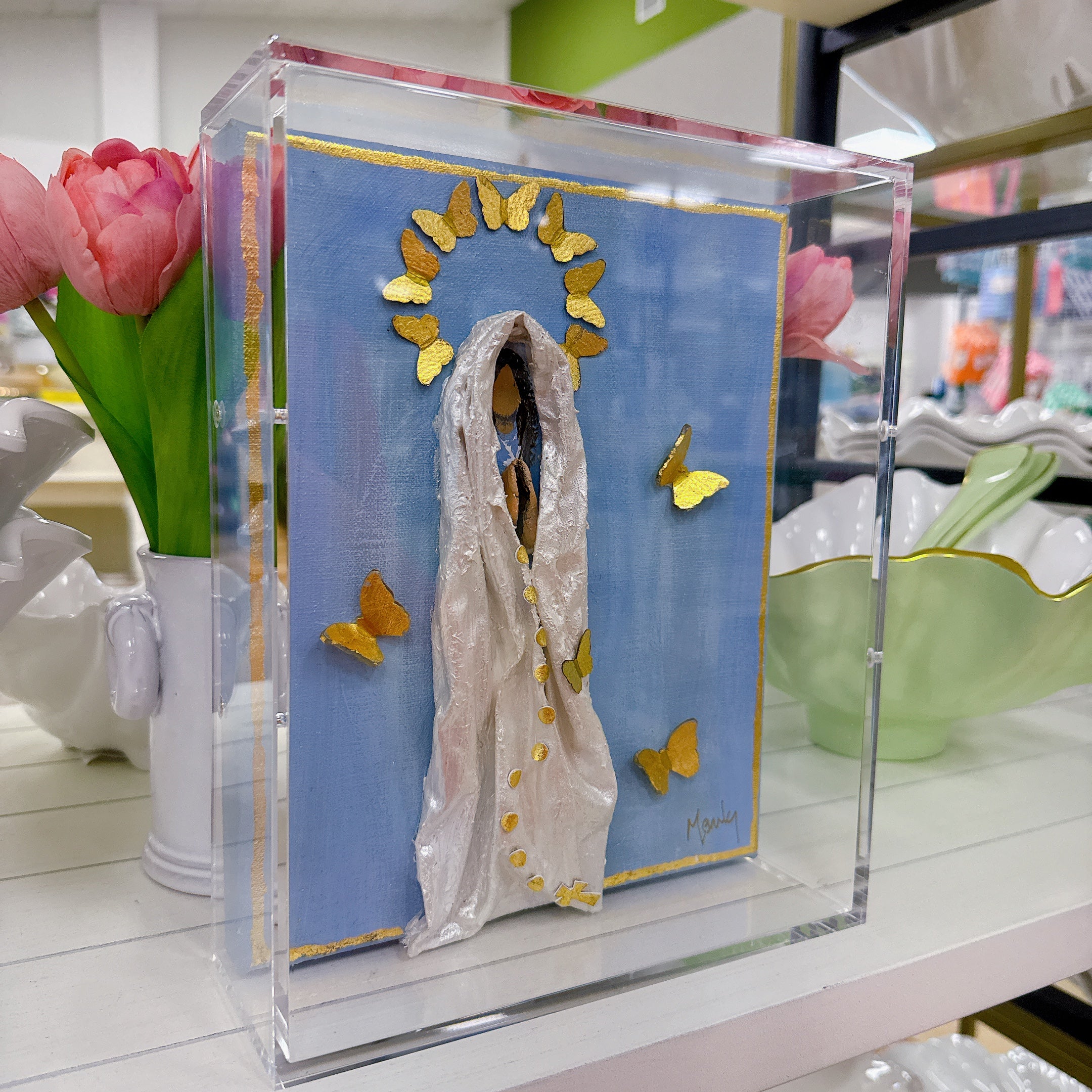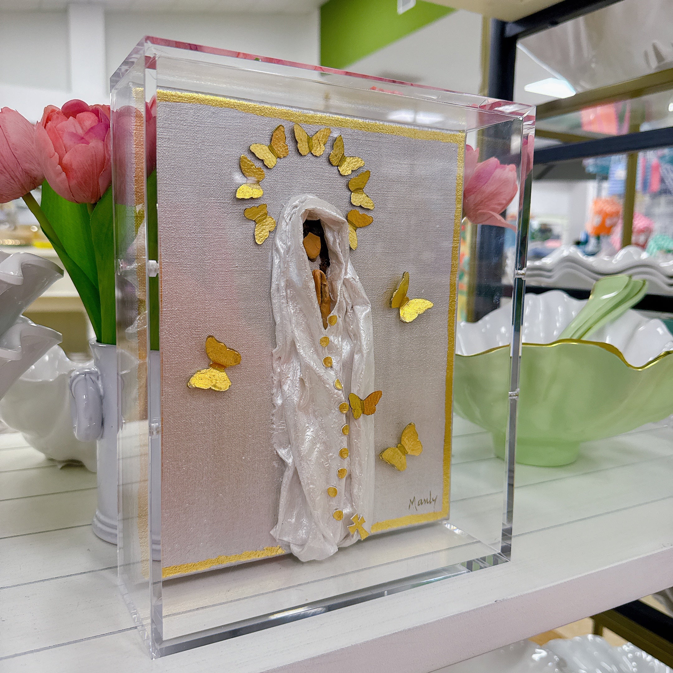 Indulge in the divine beauty of "Mary and Butterflies with Rosary" by Dana Manly. This 8 x 10 shadow box features intricate artwork that symbolizes spirituality and the interconnectedness of life. Let its deeper meaning and divine inspiration elevate any space.