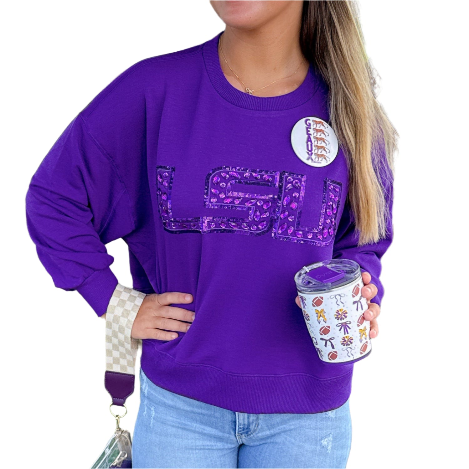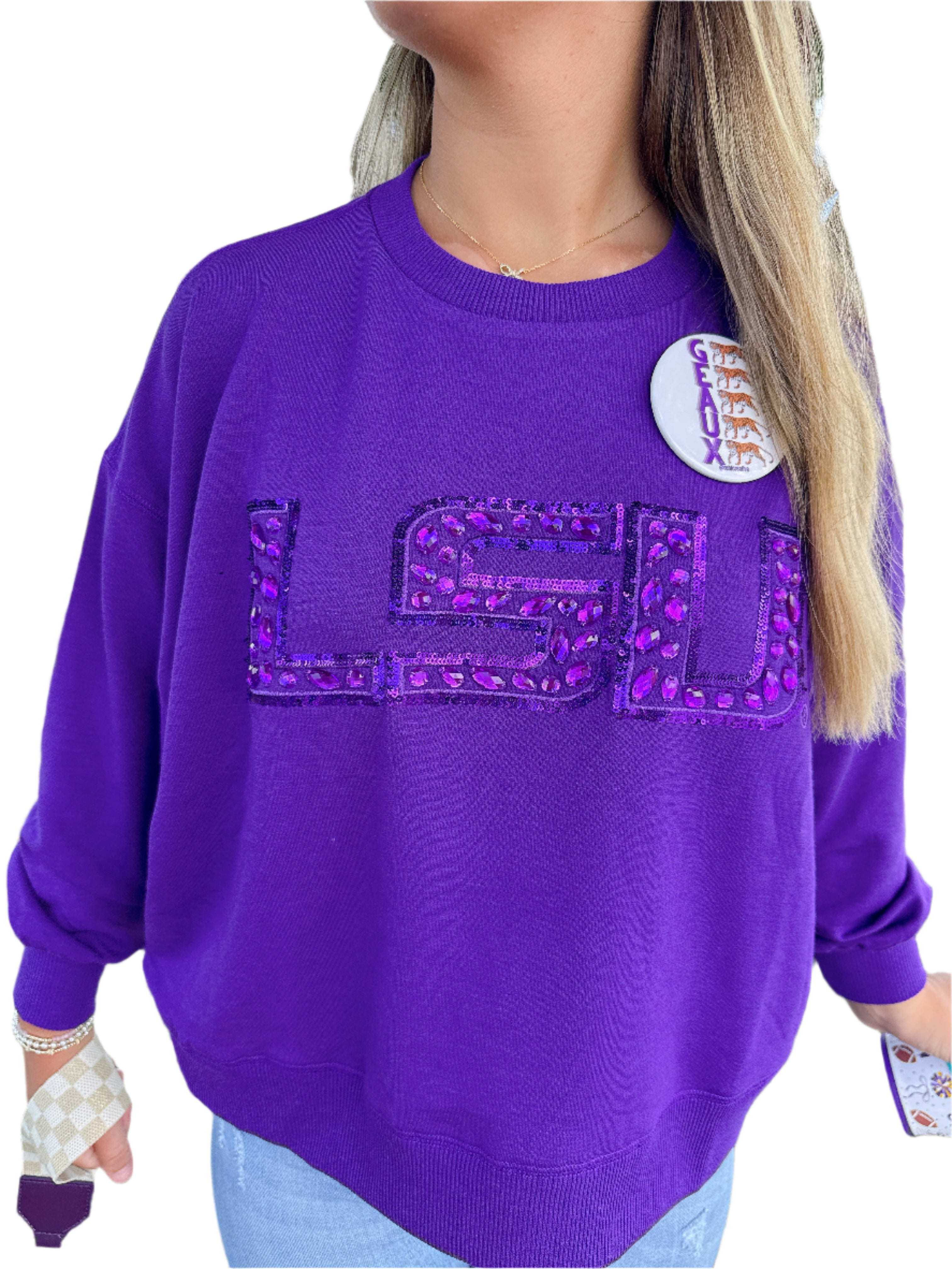 Stay cozy and show your Tigers pride with the Millie LSU Sweatshirt! This oversized purple sweatshirt features sparkling LSU letters crafted from purple gems, adding a fun and flashy twist to your game day look. Perfect for lounging or cheering on your team in style.