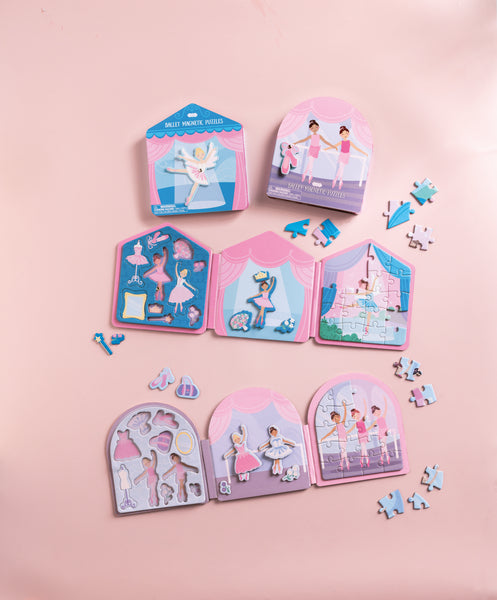 Ballet Puzzle Book offers a delightful and interactive experience for young ballet enthusiasts. This charming set includes a beautifully illustrated play scene that captures the magic of a ballet recital, complete with a stage and audience. The magnetic puzzle pieces feature adorable ballerinas, props, and accessories, allowing children to create their own enchanting performances. Designed for convenience, the magnetic pieces stay securely in place, making it perfect for travel and on-the-go fun. Ideal for children aged 3 and up, this compact 7 1/2" x 6 1/2" puzzle book encourages creativity, storytelling, and fine motor skills development. Crafted from durable paper, it promises hours of imaginative play and is a wonderful gift for any budding dancer.