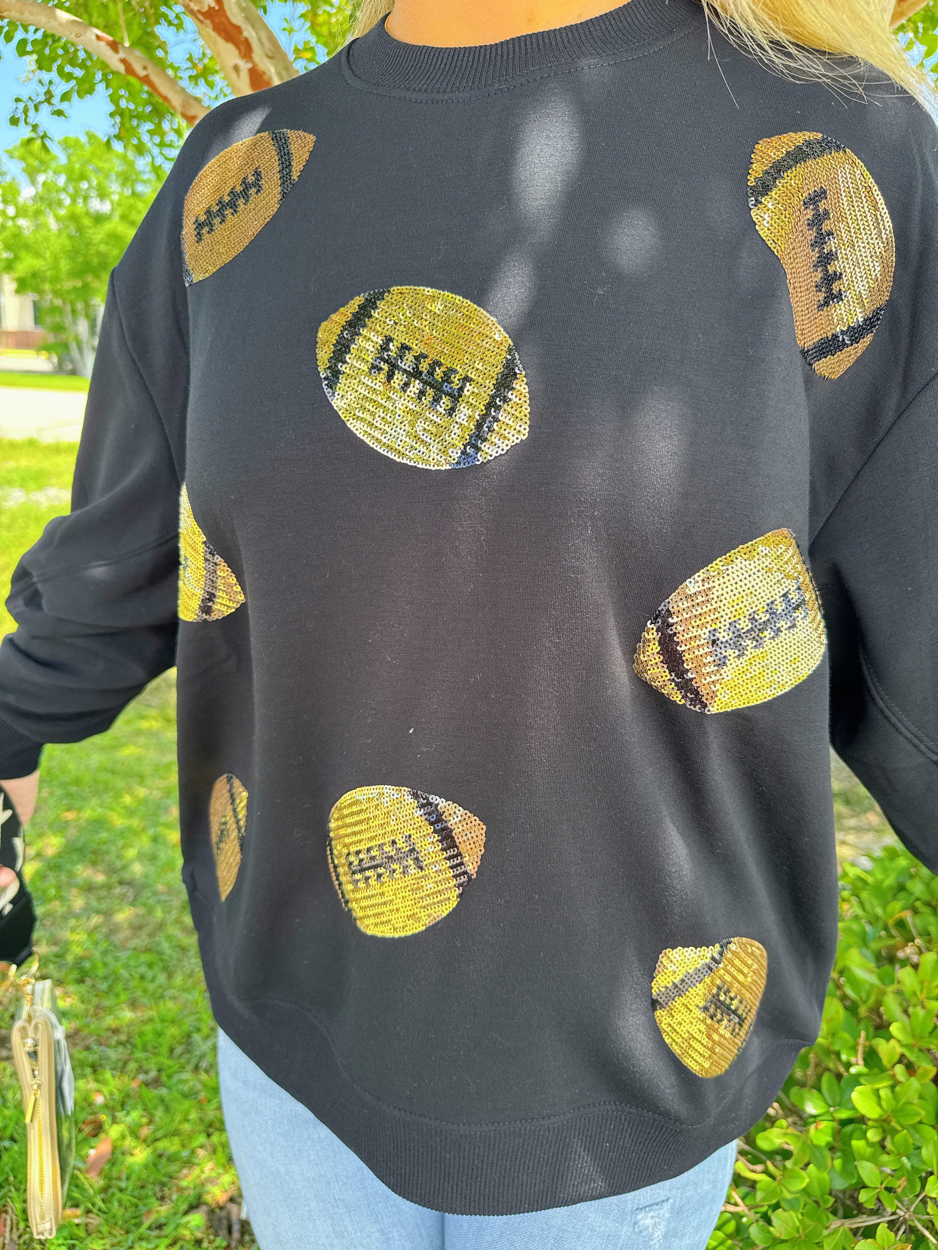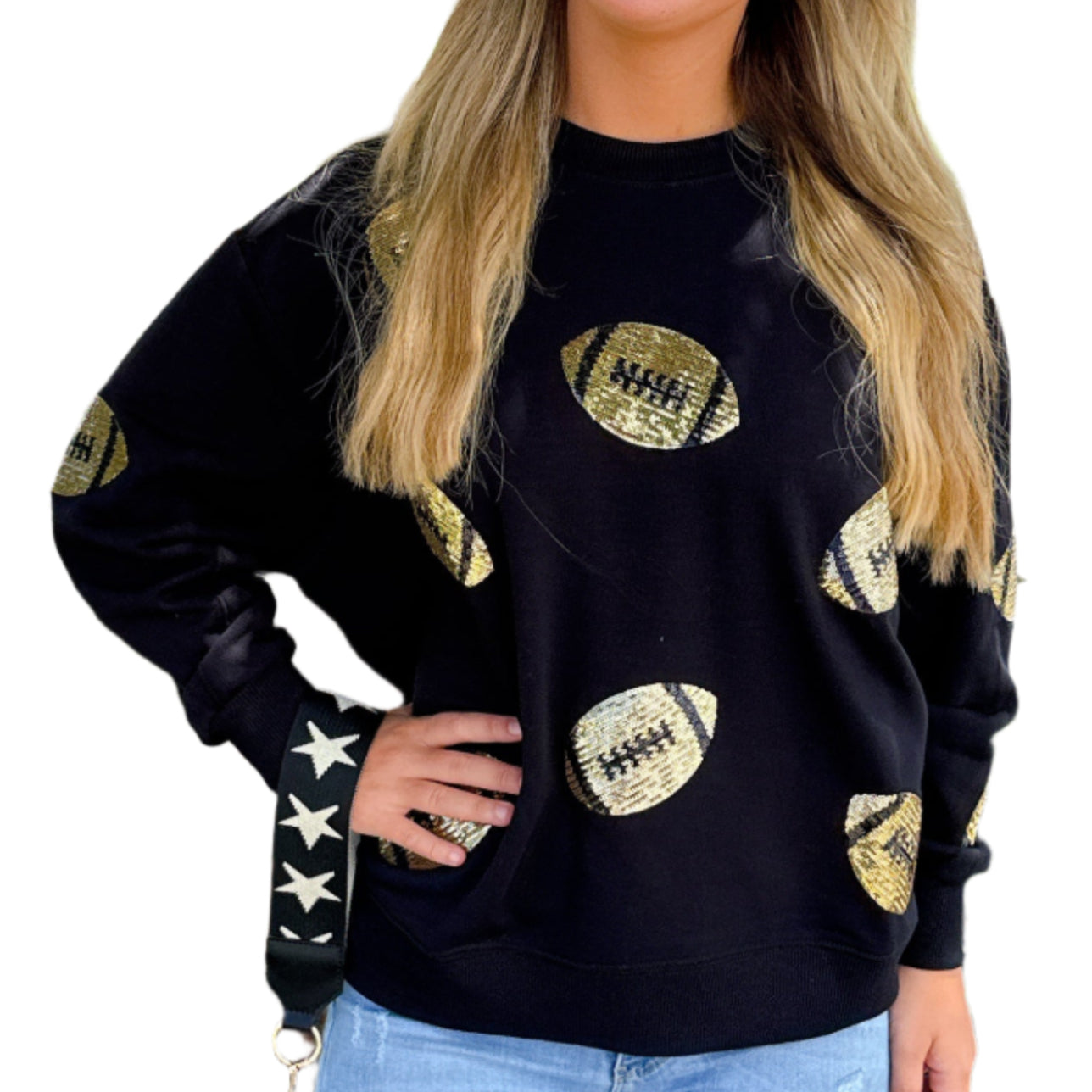 Get game-day ready with the Sarah Sequin Football Sweatshirt! This playful sweatshirt combines sporty vibes with sparkling sequins, making it perfect for cheering on your team in style. Cozy and eye-catching, it’s your new go-to for fun, casual wear that scores big on comfort and flair.
