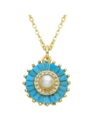 This beautiful Turquoise Sphere necklace features a circle of baguettes surrounding a pearl in the middle. The necklace is made of stainless gold plate, making it a durable and elegant piece of jewelry perfect for any occasion. 16" plus 2" extender