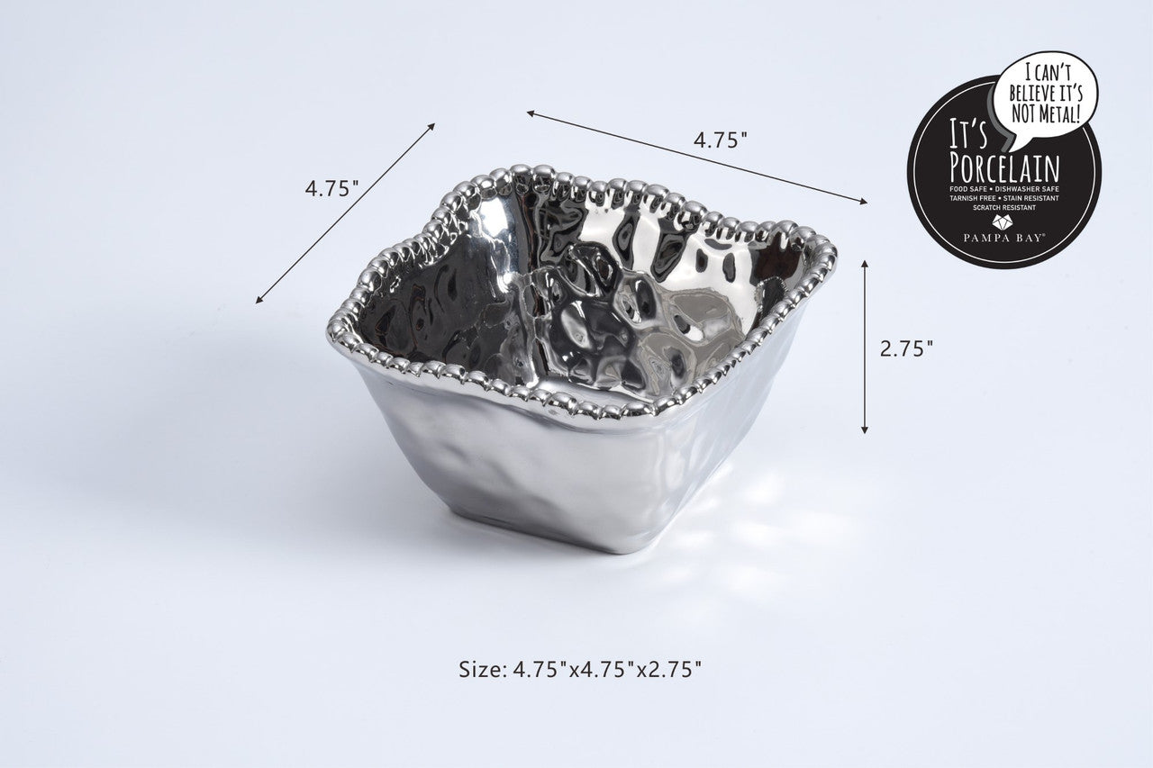 Square snack bowl in Verona. Great for individual snacking, dips or for toppings for a make your own taco, sundae or pizza night! A perfect addition to any bar for lemons and limes. Striking and elegant titanium finished high-fired porcelain. Food safe, tarnish free, dishwasher safe, oven safe to 500°. Tarnish and stain-free. Easy Care.